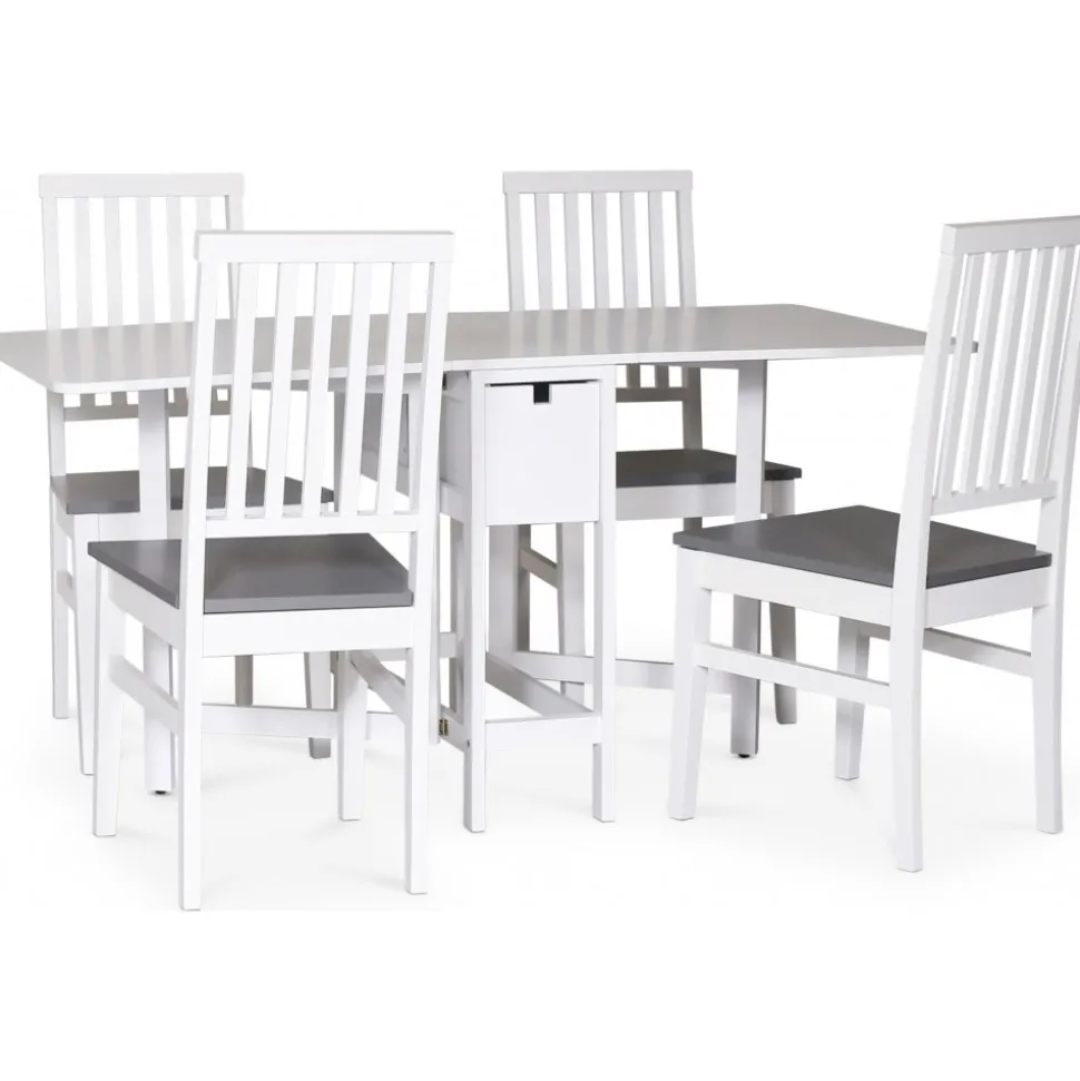 Sandhamn Klassiskt utförande. Stilrent klaffbord med 4 st matchande Fårö stolar i vitlackat trä med grå träsits.