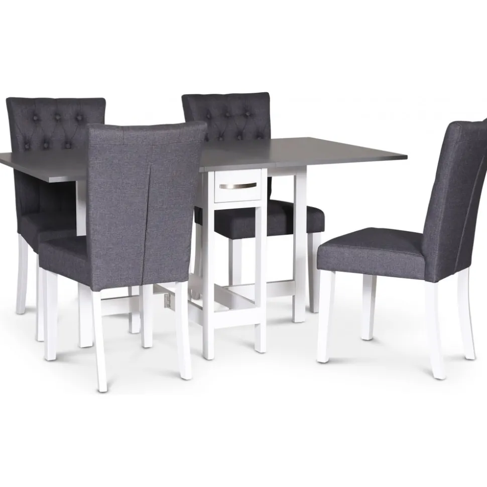 - Matgrupp; klaffbord Vit / Grå med 4 st klädda stolar – Fårö