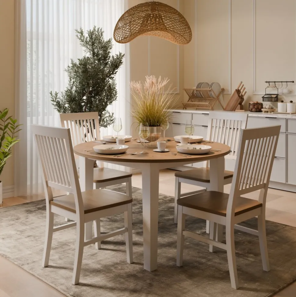 - Matgrupp: Läckö matbord, runt – vit / oljad ek + 4 st Selma stol – vit / oljad ek