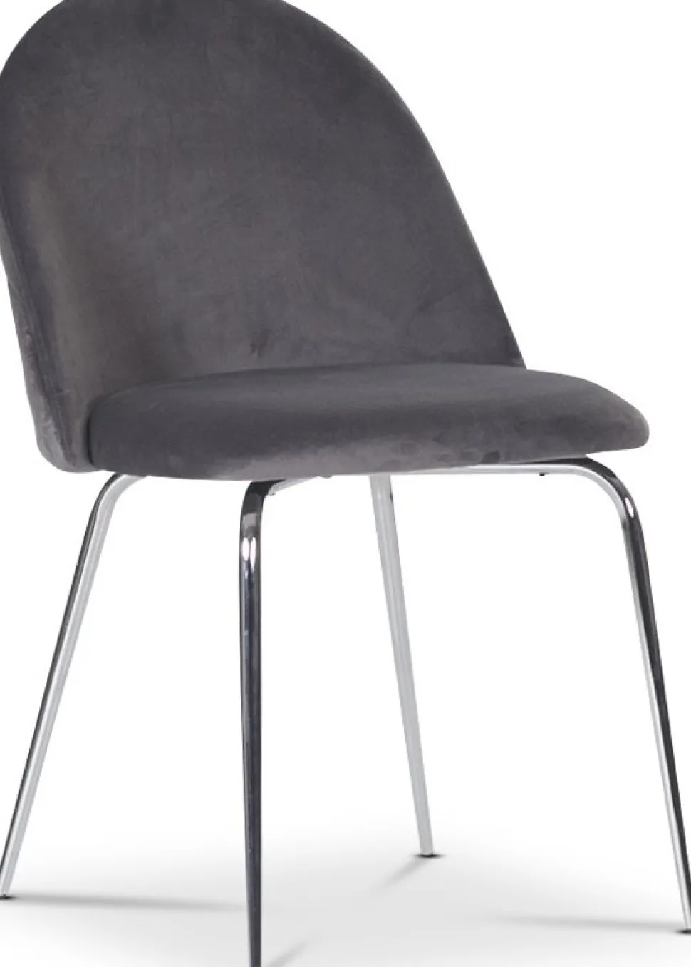 Plaza stolar ger matgruppen en exklusiv touch med sin mjuka sammetsklädsel i grått och dekorativa diamantmönster på ryggstödet. De kromade benen tillför modern karaktär och stabilitet, medan den stoppade sitsen erbjuder bekväm komfort.