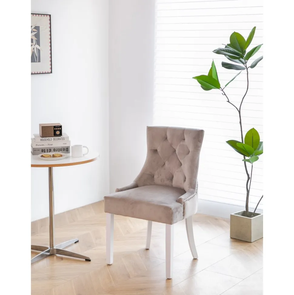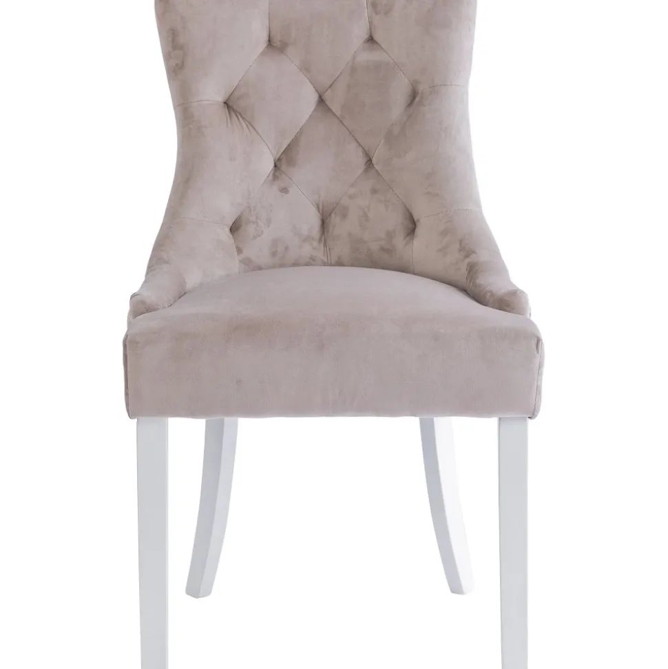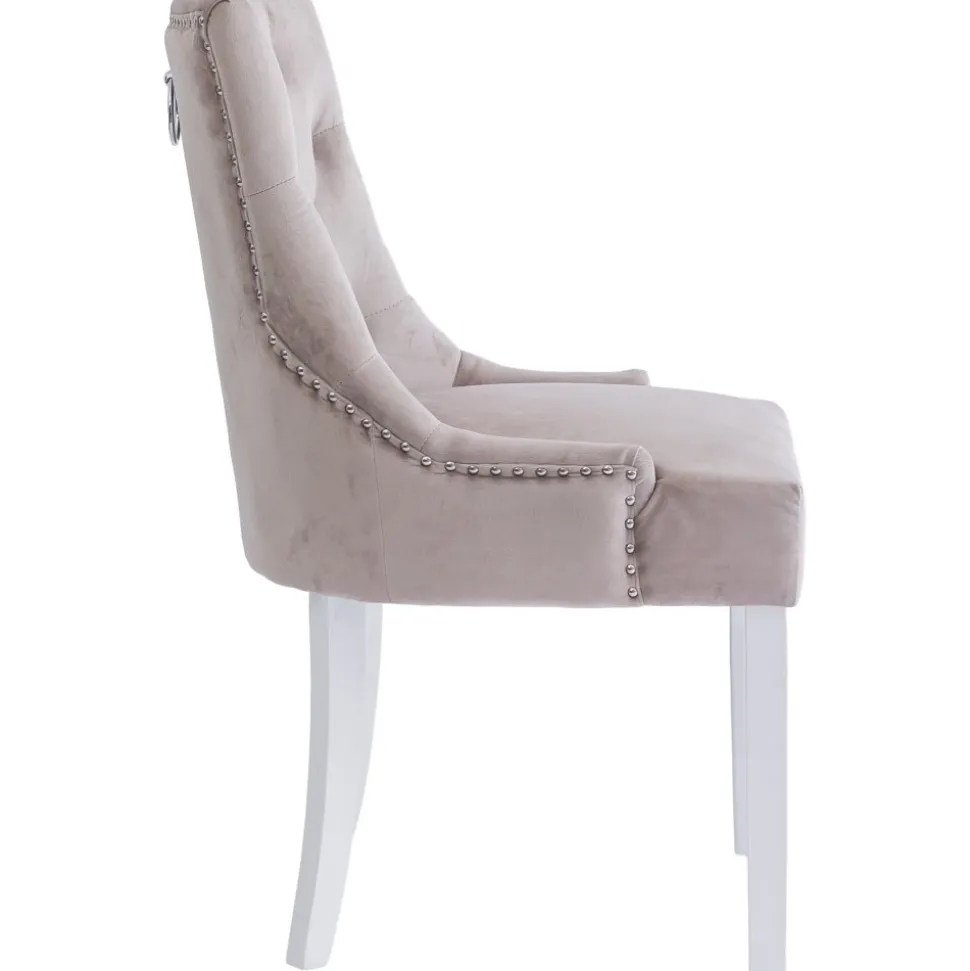Matstol i beige sammet med kromade nitar och ring-handtag i ryggen. Matstolen har vitlackade träben. Varje är noggrant välarbetad för att säkerställa både kvalitet och hållbarhet. Tuva-stolen är mer än bara en matstol; den är en inredningsdetalj som lyfter hela din matplats. Perfekt för både vardagligt bruk och festliga tillfällen när du vill bjuda in till gemenskap och stil.