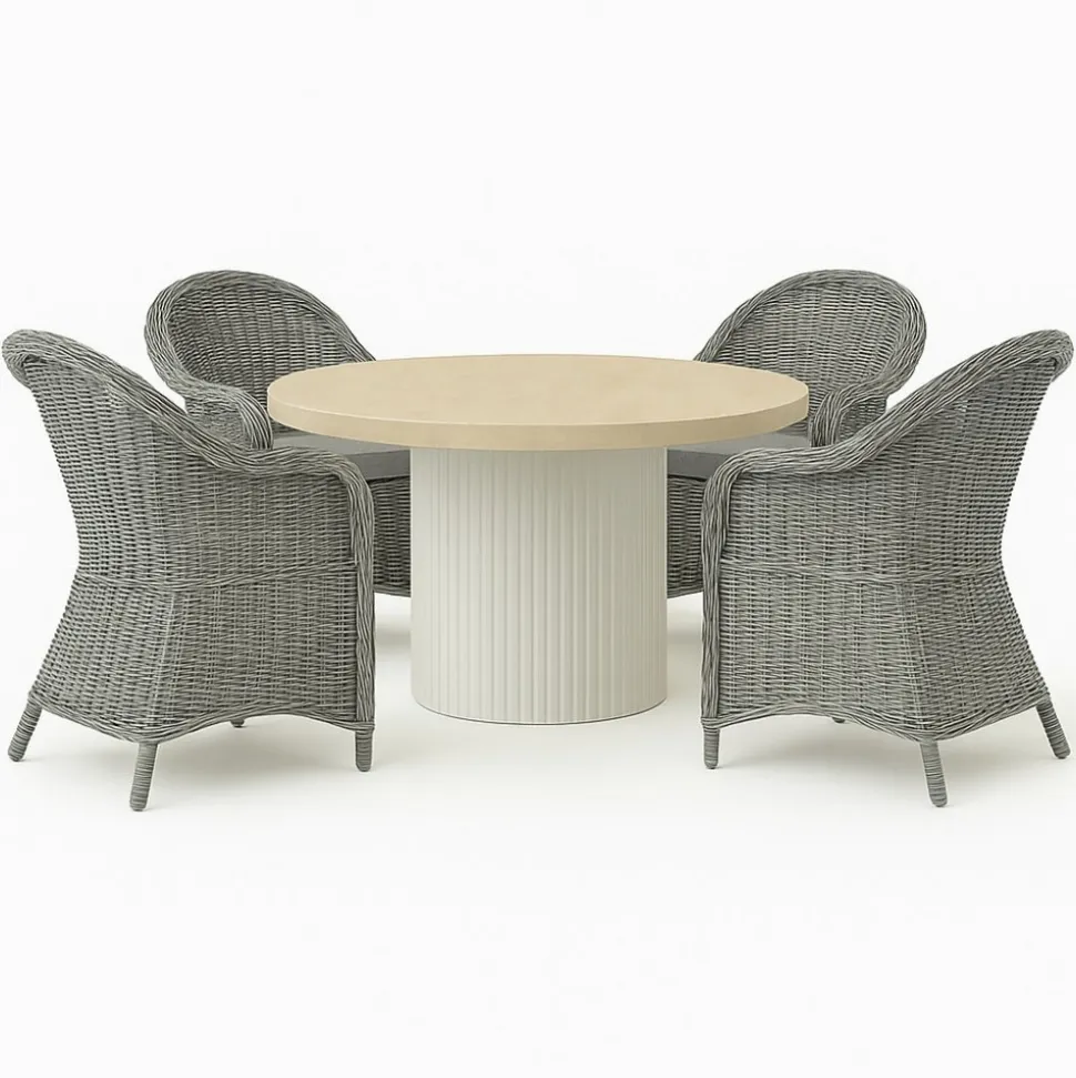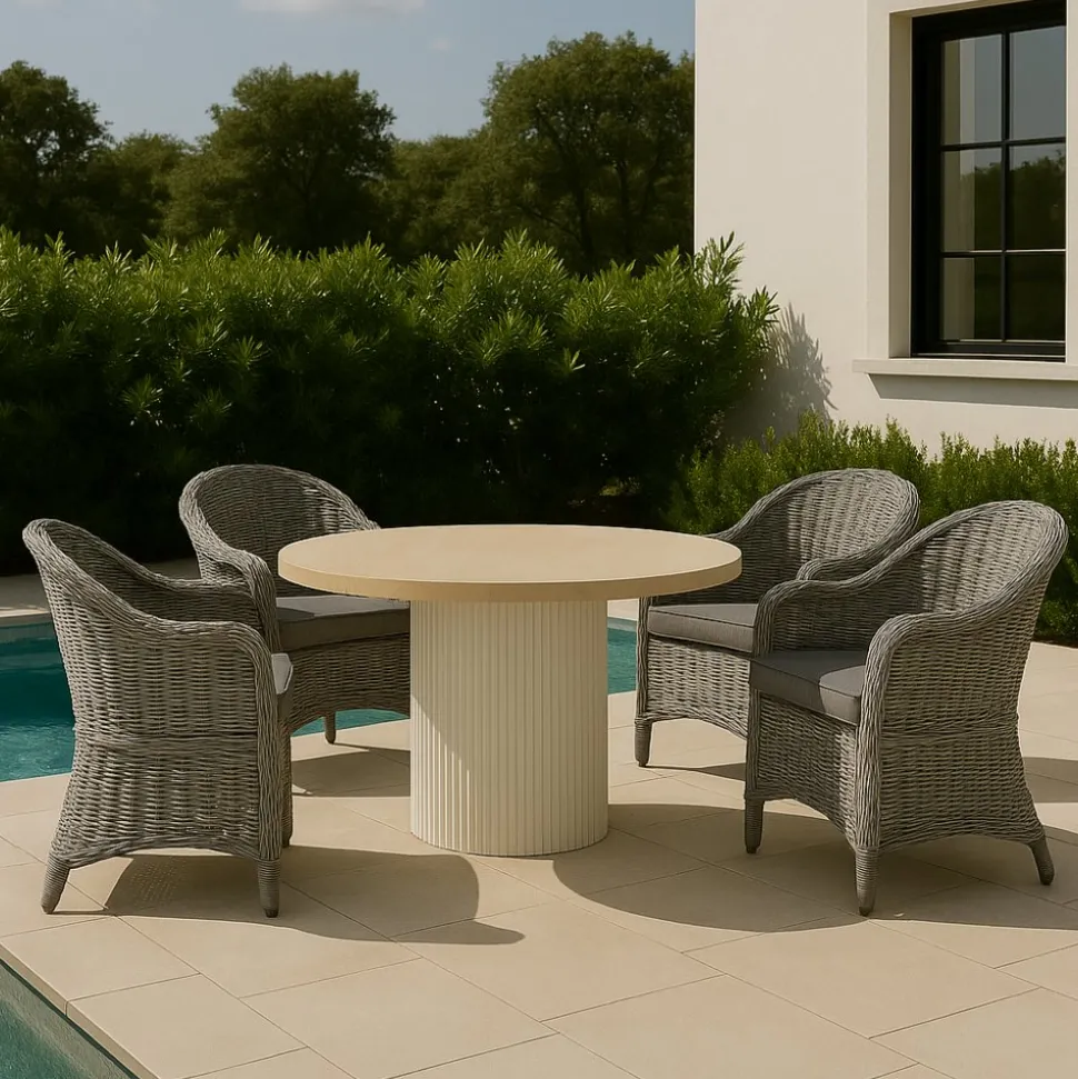 Matgrupp till uteplatsen. Runt bord med 4 st sköna mercury fåtöljer.