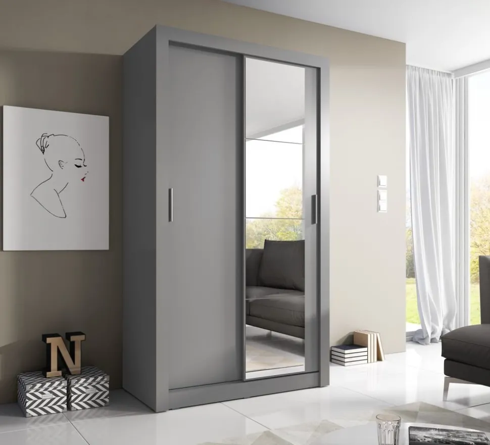 En snygg och mycket rymlig med en modern design. Tillverkad i Chipboard och med många förvaringsmöjligheter. Bakom de två skjutdörrarna, varav en med spegel, finner du massa med utrymme, klädstång och hyllplan. Handtag av plast med blank finish. Levereras omonterad.