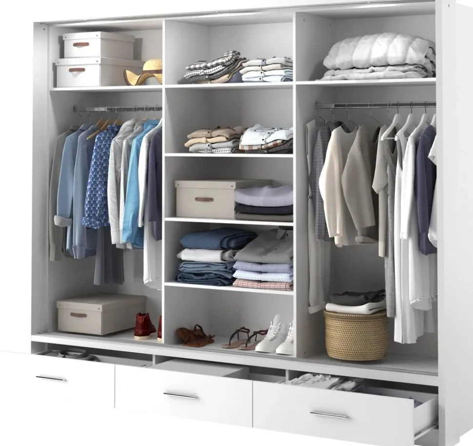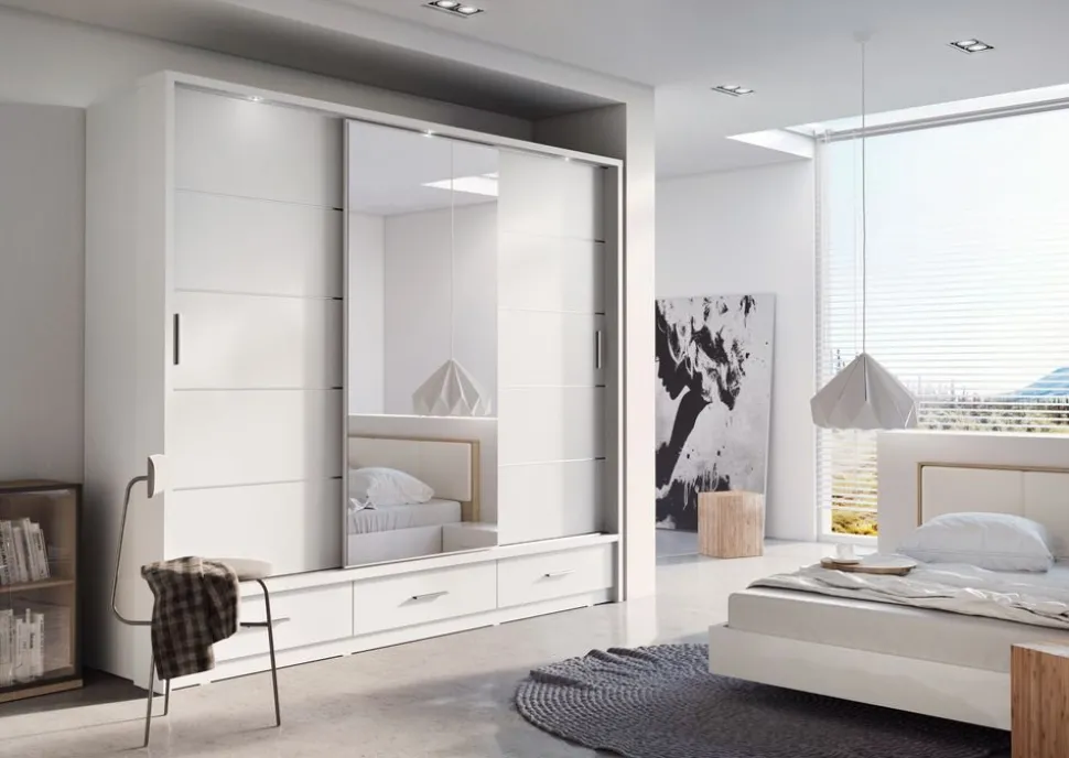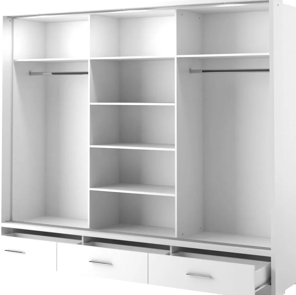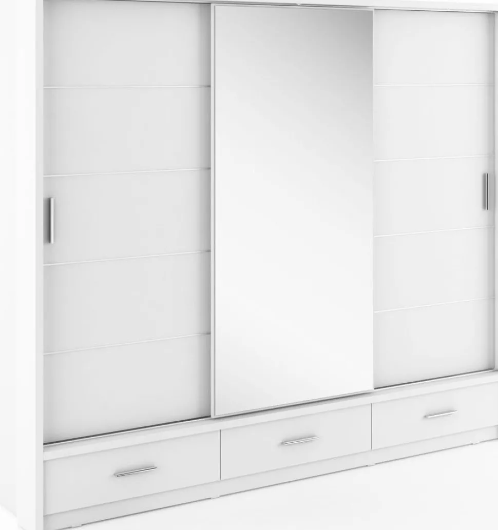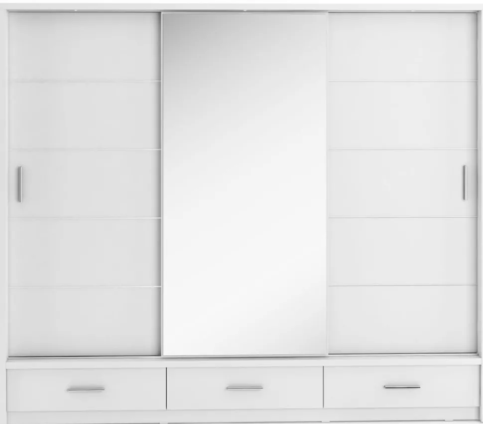 En snygg och mycket rymlig med en modern design. Tillverkad i Chipboard och med många förvaringsmöjligheter. Bakom de tre skjutdörrarna, varav den i mitten har en stor spegel, finner du massa med utrymme, klädstång och hyllplan. Energisnål LED-belysning ingår. Handtag av plast med blank finish. Levereras omonterad.