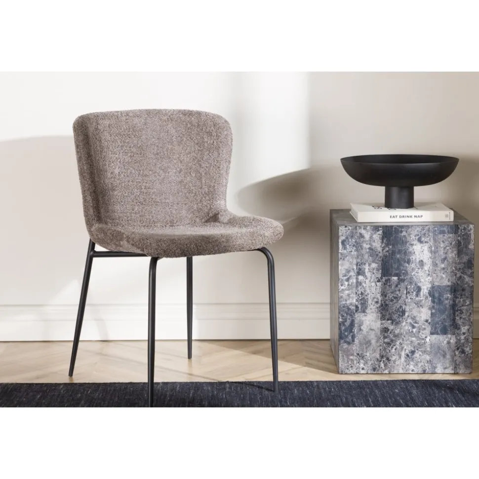 Matstol som är lika trendsäker som bekväm. Skapa en inbjudande atmosfär i hemmets hjärta med den här mjuka matstolen i skandinavisk design. Stolen är helklädd i brunt lurvigt tyg med stilrent smala stolsben i svart metall. Den lätt rundade ryggen och stoppade sittdynan ger extra komfort och förlänger trivsamma måltider kring matbordet.