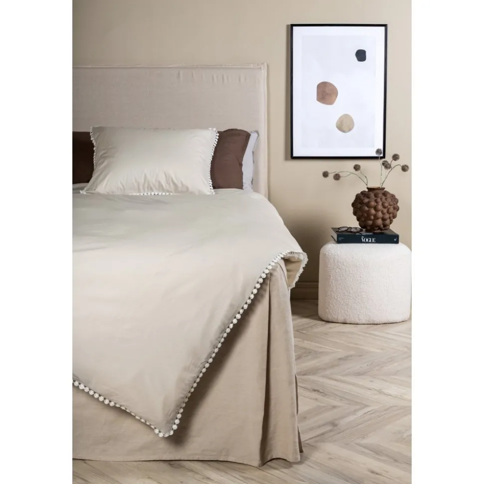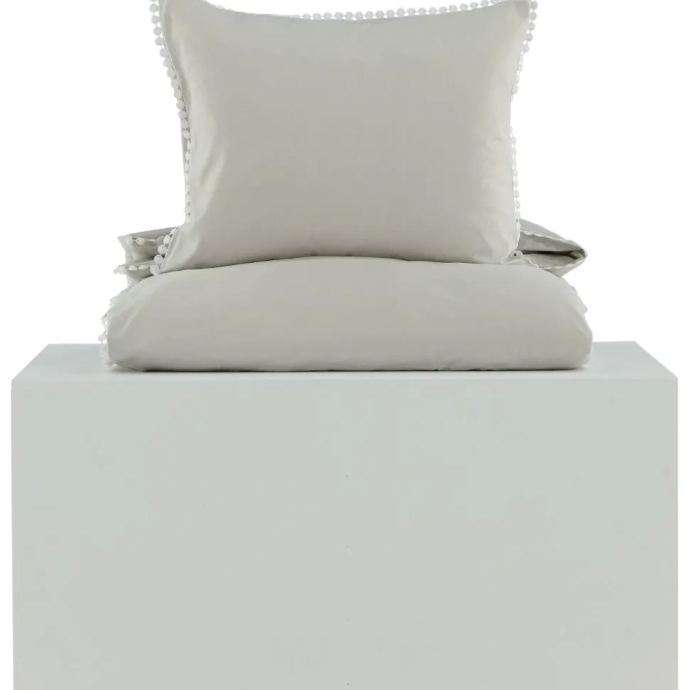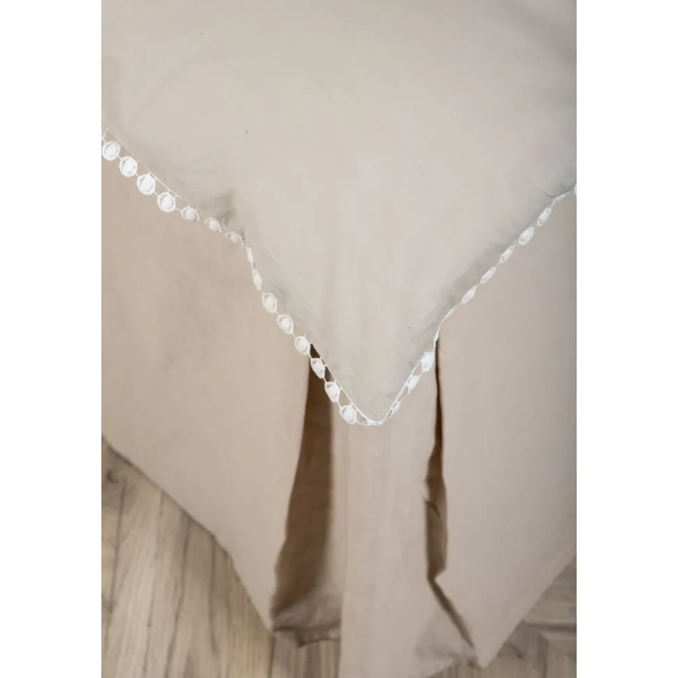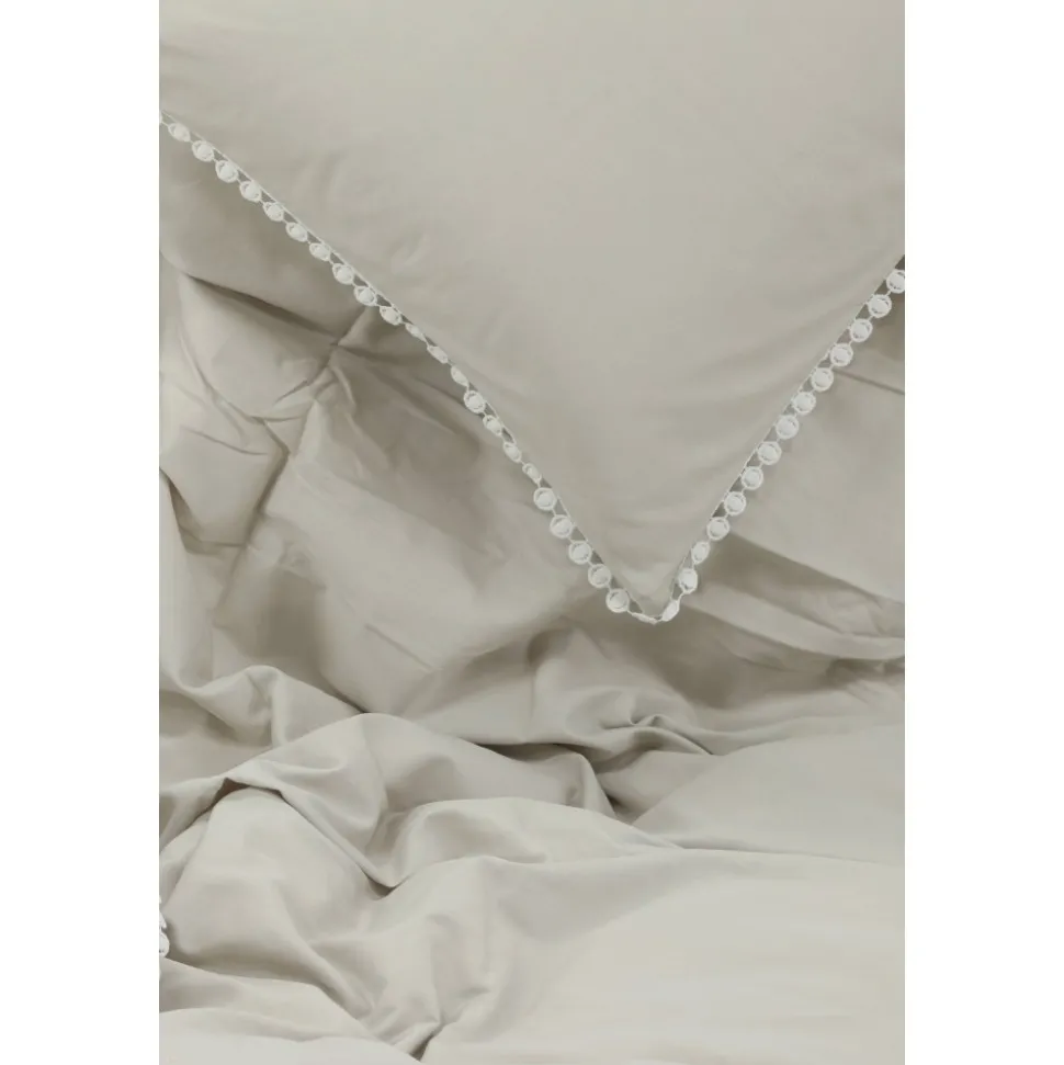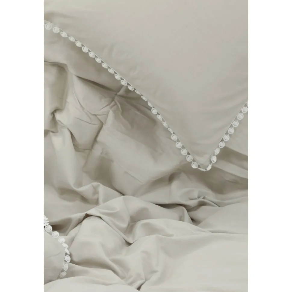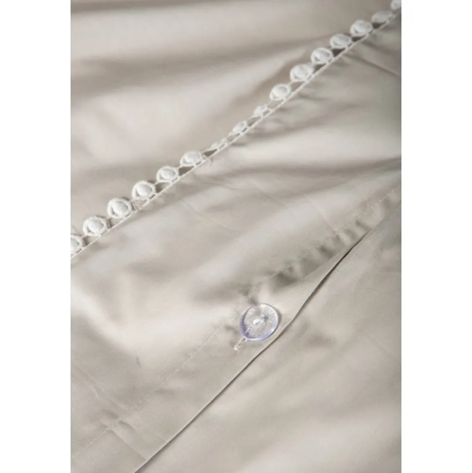 Påslakanset i bomullssatin för en mjuk och sval känsla mot kroppen. Dekorativ kant i spets med volanger.