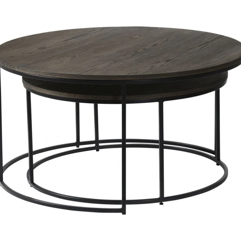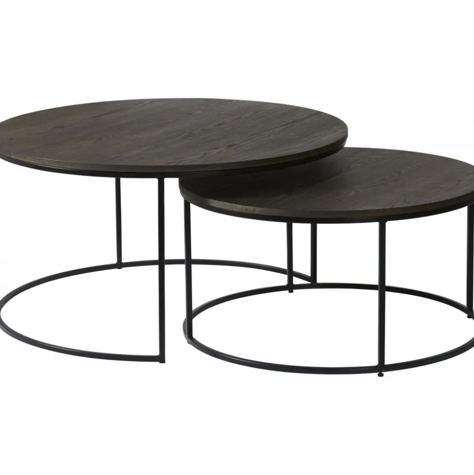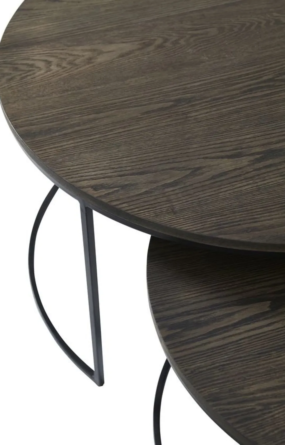 Soffbord i set, 2 st runda med toppskiva av MDF/ekfaner och underrede av svart metall.