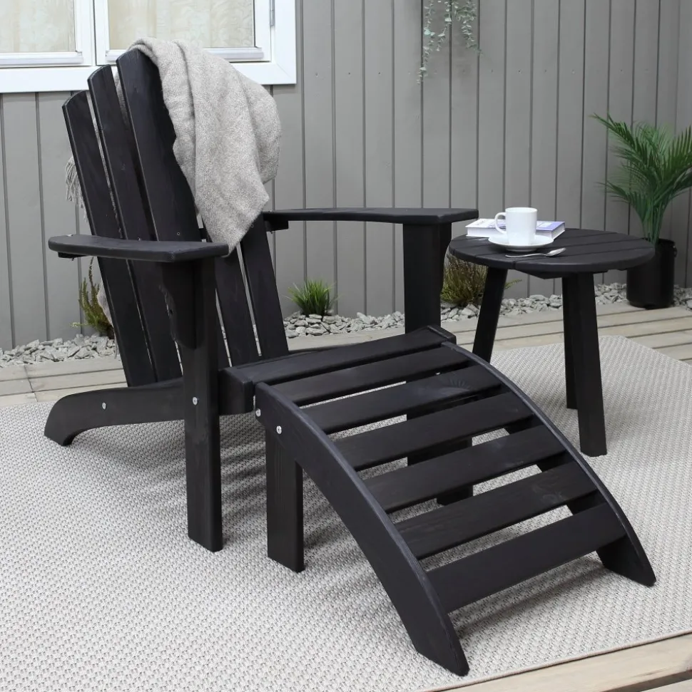 Däckstol i svartbrunt laserad furu. Dess avspända ryggvinkel och breda armstöd ger dig goda förutsättningar att koppla av i sommarvädret. En klassisk och rejäl utemöbel som lätt blir en favorit var den än står. Komplett med och fotstöd.