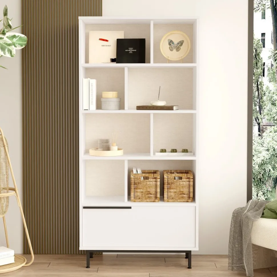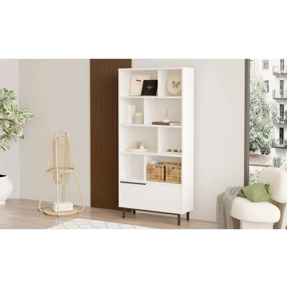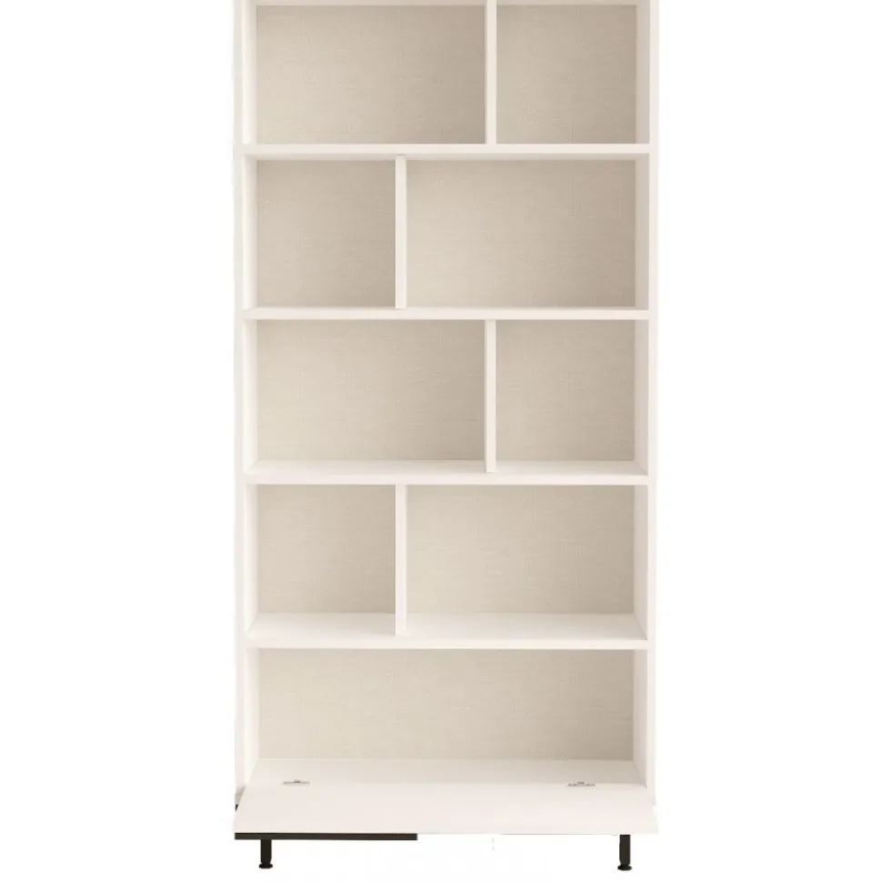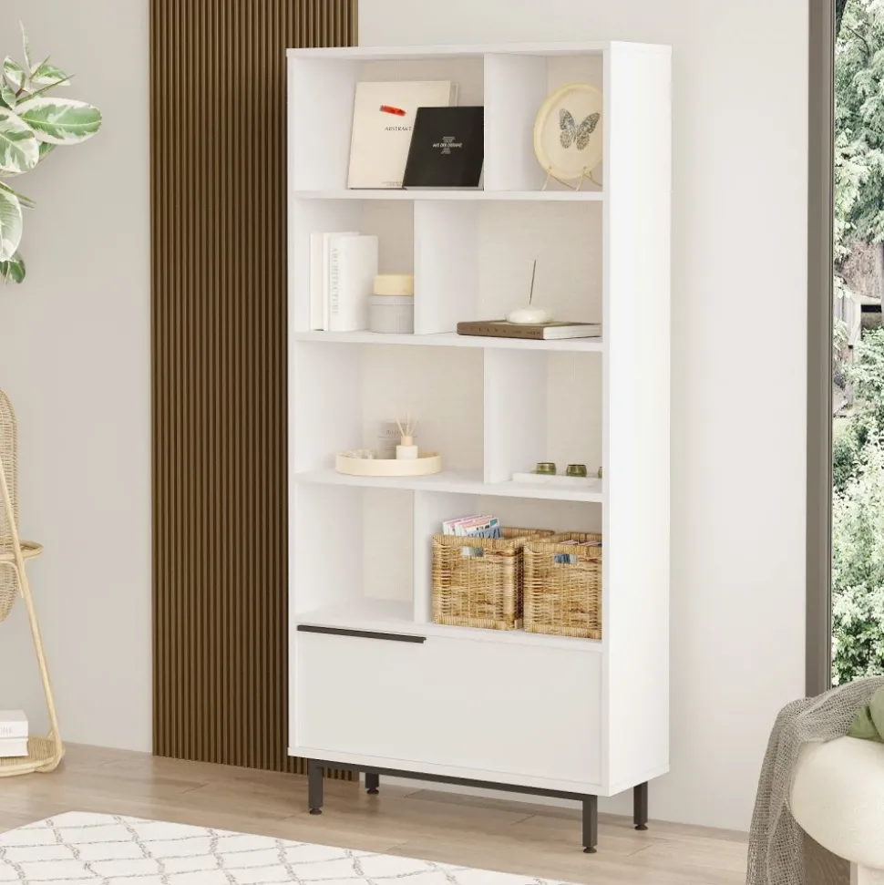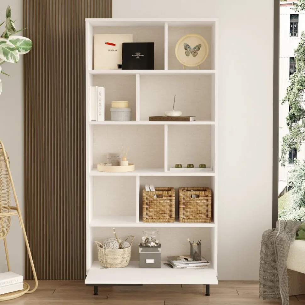 Bokhylla av melaminbelagd spånskiva med ben av metall.