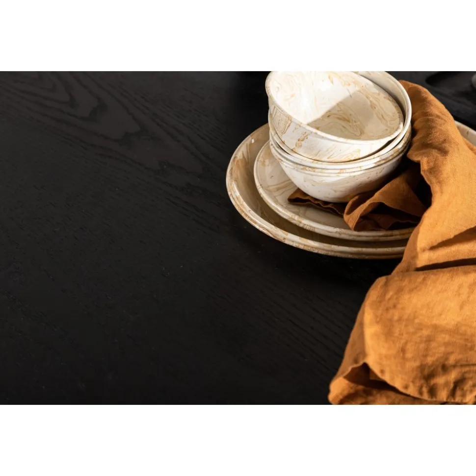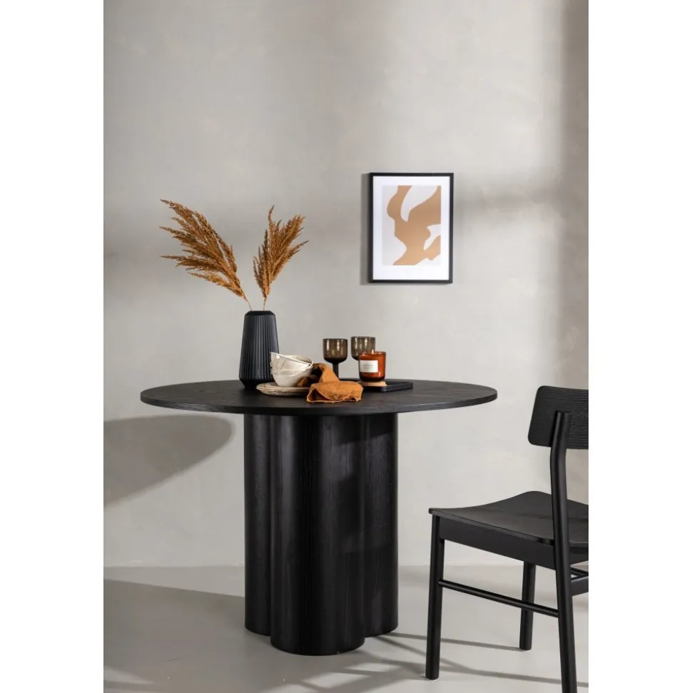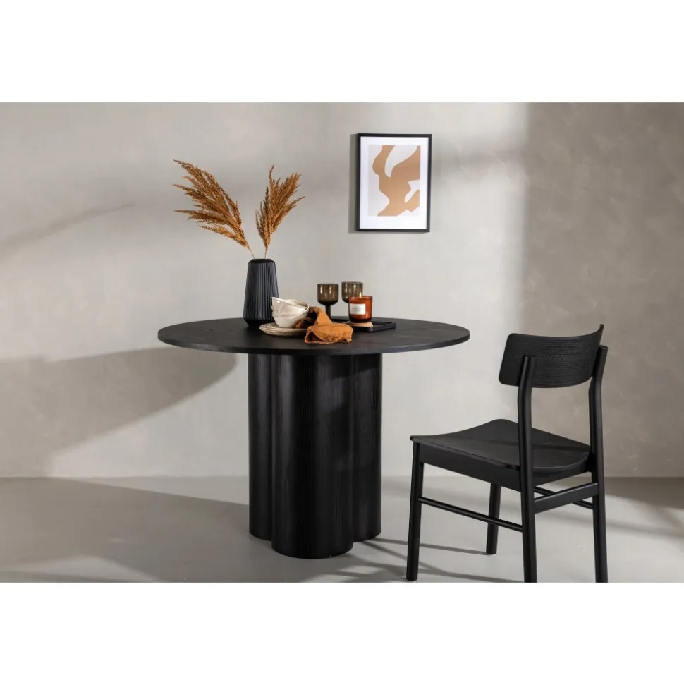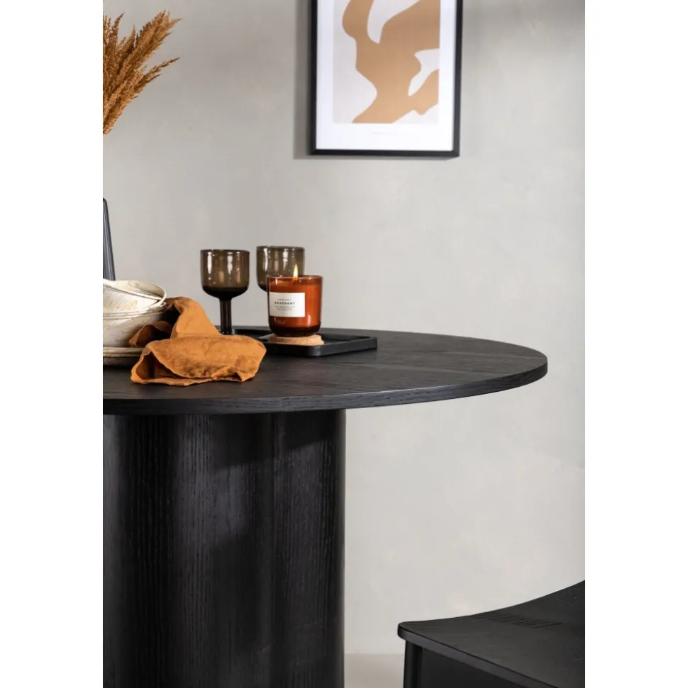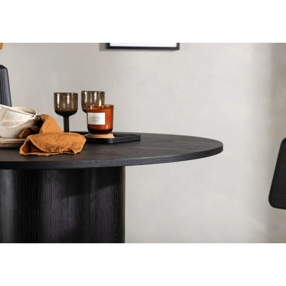Matbord som imponerar med sin skandinaviska design och smakfulla utformning. Bordet har en genomgående helhetsdesign i svart MDF med en tunn, rund toppskiva och tre cylinderformade ben som sitter samlat under bordets mitt. Det tunna färglagret synliggör materialets mönster och ger liv och rörelse till bordet.
