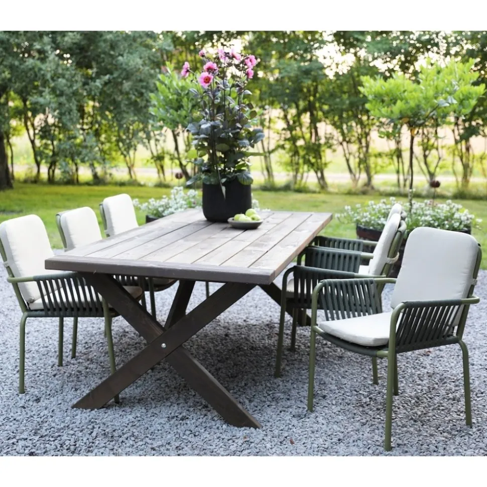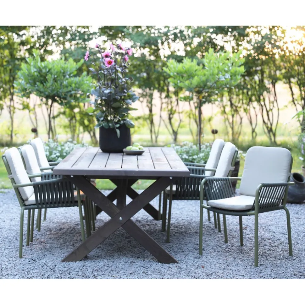 Inklusive 6 st sköna Lincoln stapelbara karmstolar i grönlackad aluminium stomme med en beioge dyna för rygg och sits. Matgruppen passar perfekt på altanen, uteplatsen och i uterummet.