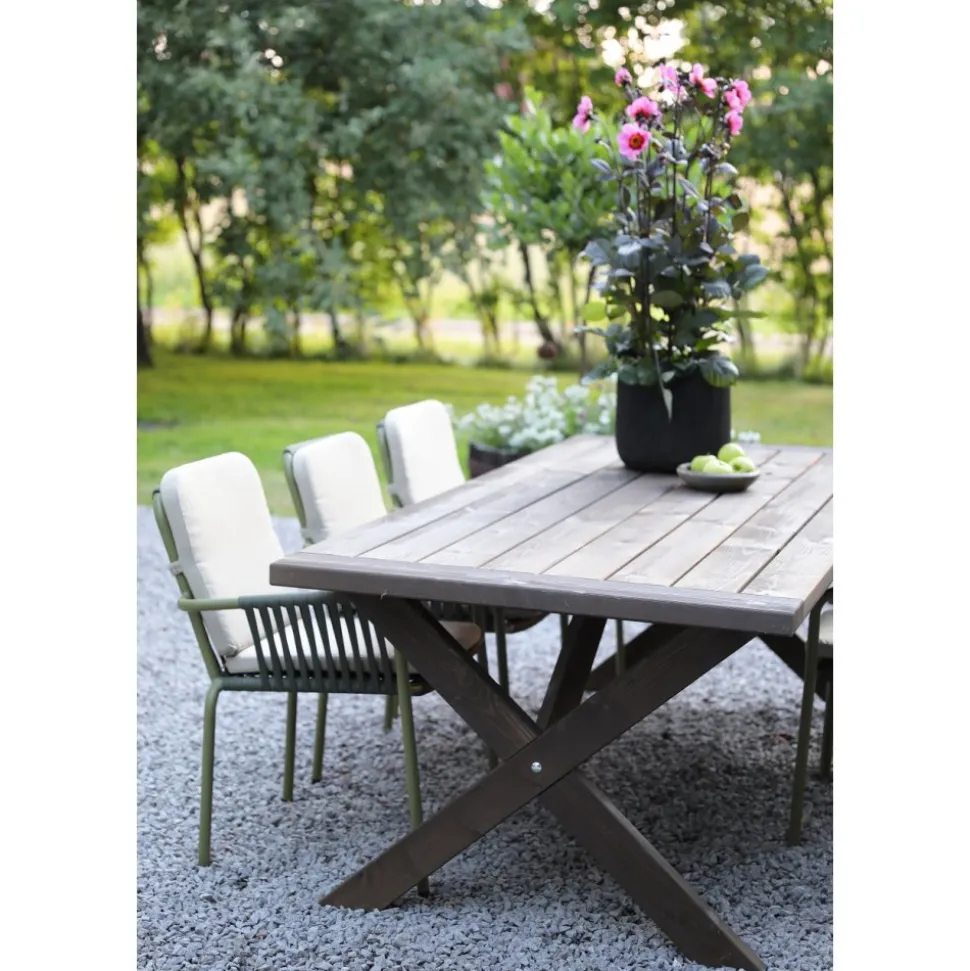 Matgrupp innehållande matbord i brunsyrad furu. Bordet har kryssben och bordsyta av plank, ger ett robust och karaktäristiskt utseende.