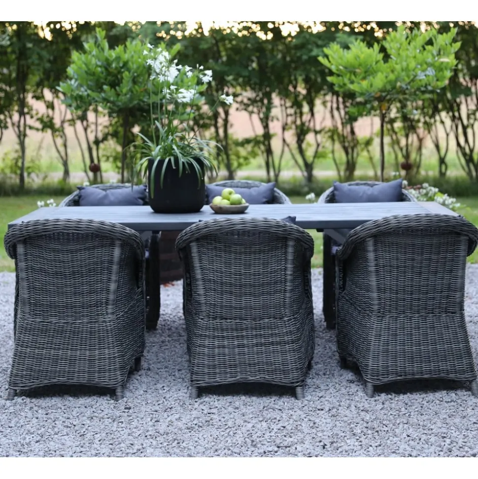 Inklusive 6 st Mercury fåtöljer i matchande grå konstrotting med sittdyna och ryggdyna för bästa komfort. Matgruppen passar perfekt på altanen, uteplatsen och i uterummet.