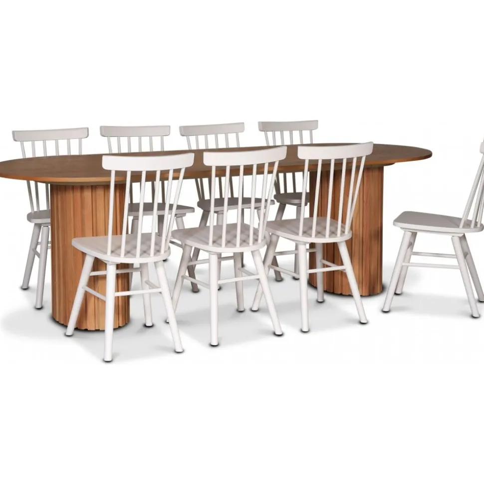 Inklusive 8 st Orust pinnstolar, en svenskdesignad klassisk pinnstol i massivt trä som ger en skön tyngd och kvalitet i stolen. Stolen är i vitlackat utförande med sex ribbor i stolsryggen. Den har en djupare sits och en stabilare konstruktion.