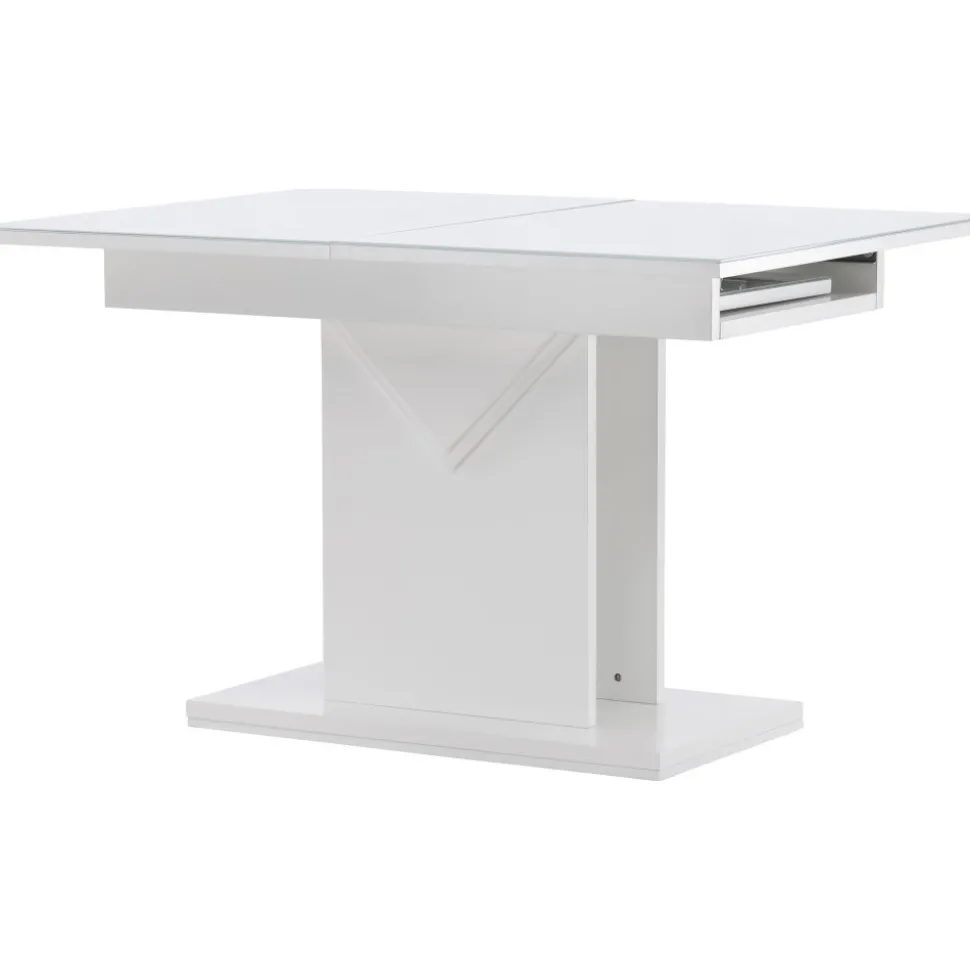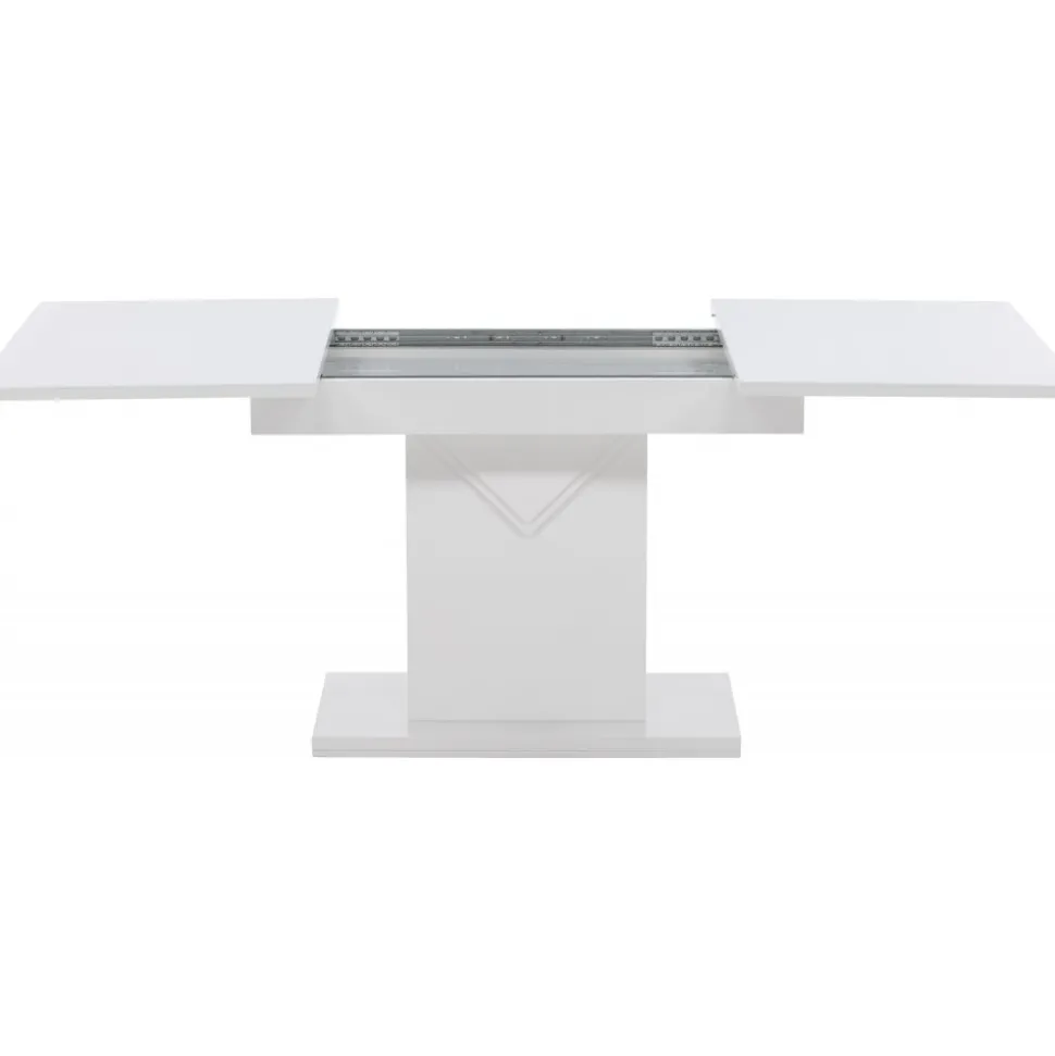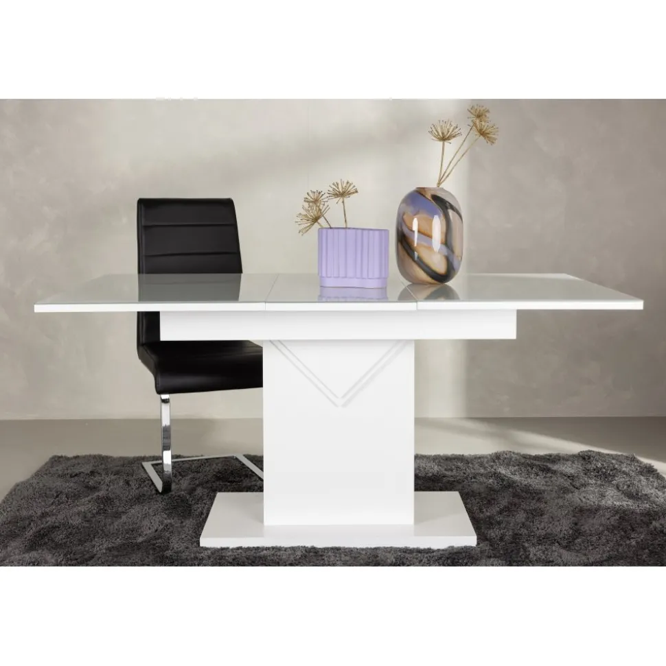 Elegant och pampigt med bordsskiva i MDF med en toppskiva i glas. Underredet är robust och center placerat. Bordet är förlängningsbart vilket gör att det lämpar sig utmärkt både till små och stora sällskap. Bjud in till många sociala stunder framöver!