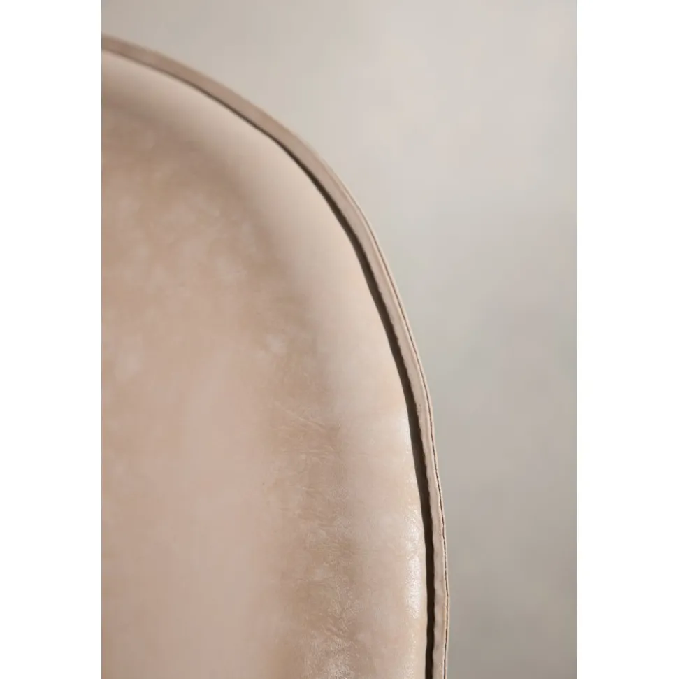 Den här stilsäkra fåtöljen har en trendsäker kulör med en mjuk sits i beige konstläder och utsvängda ben i ek. Den skandinaviska designen är genomtänkt med en rundad utformning och bra balans mellan stil och komfort. Möblera intill soffgruppen eller solitär i läshörnan! Levereras omonterad.
