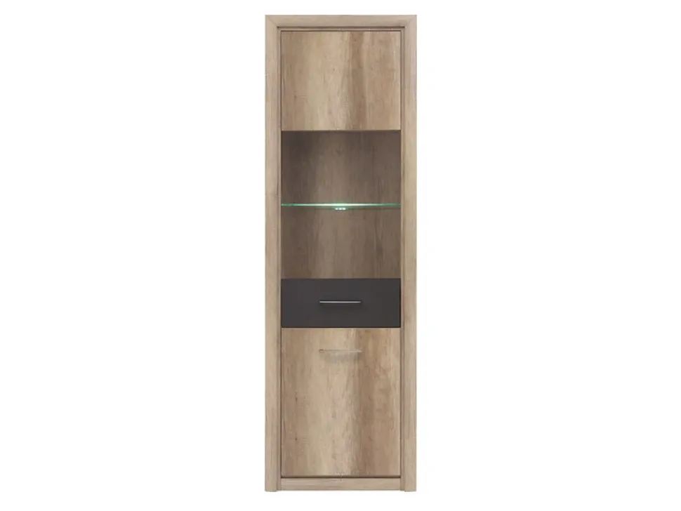 Ett fint i ekimitaion med en grå front. Skåpet är funktionellt då det finns möjlighet att både visa upp och dölja sina föremål eftersom det bara är glas på en del av dörren. Vitrinskåpet är inrett med flera hyllplan vilket gör det enkelt att hålla ordning på dina föremål.