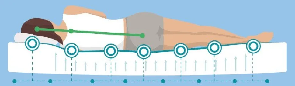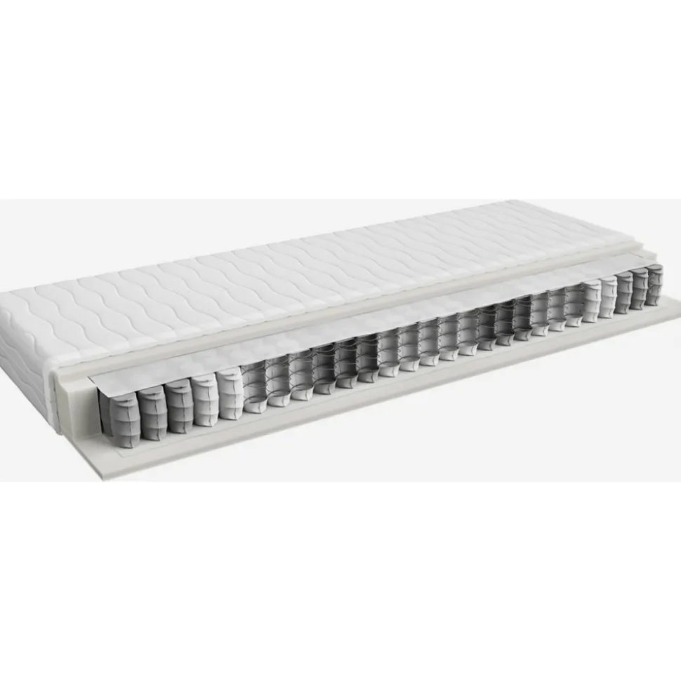 Medelhård vändbar av pocket-fjädrar och PU-skum. Avtagbar klädsel av anti-allergent non-woven tyg som kan tvättas i maskin(Max 60°C). Madrassen är indelad i 7 st komfortzoner med olika fasthet. En madrass indelad i komfortzoner följer kroppens konturer och ger extra stöd för svanken och avlastning för axlarna.