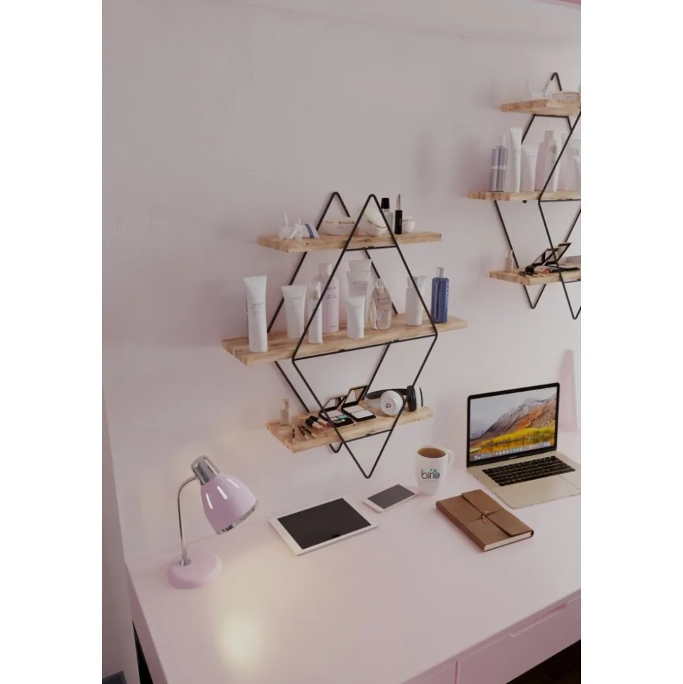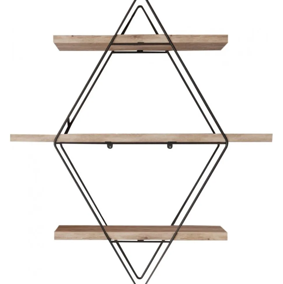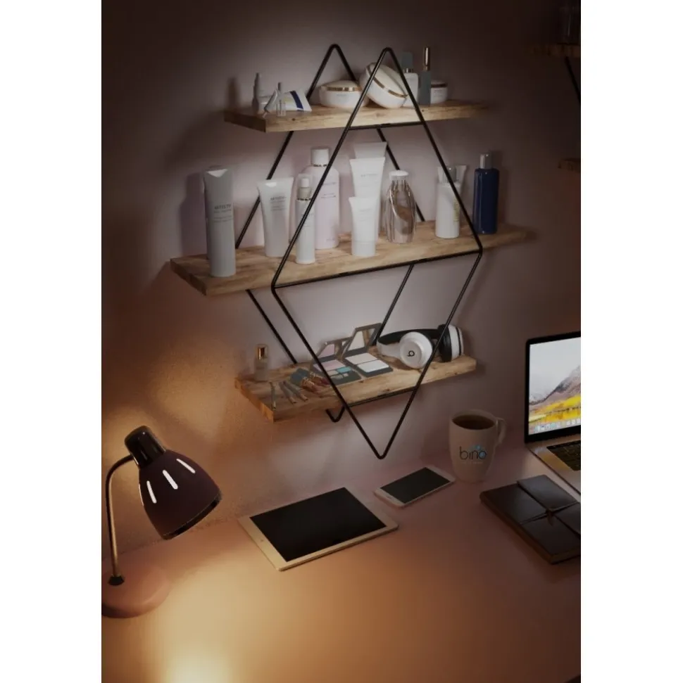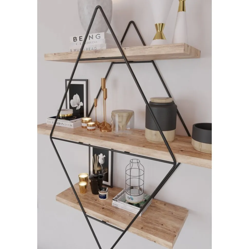 Vägghylla av trä och metall. Eftersom produkten innehåller obearbetat trä kan produkten skilja i nyans och mönster mot bilden.