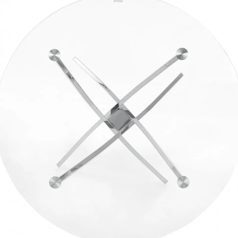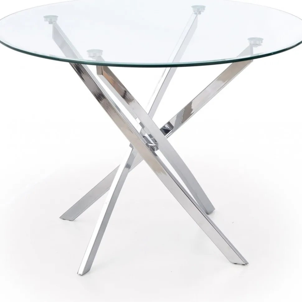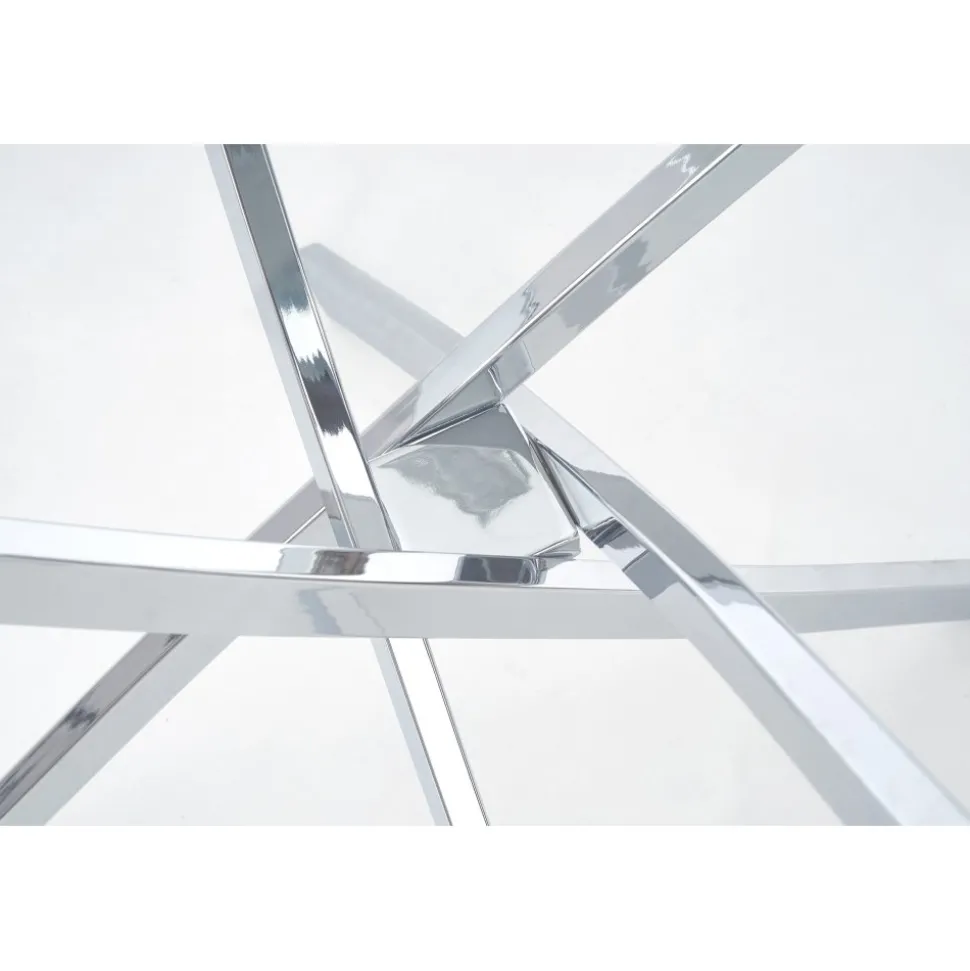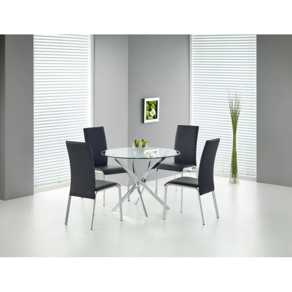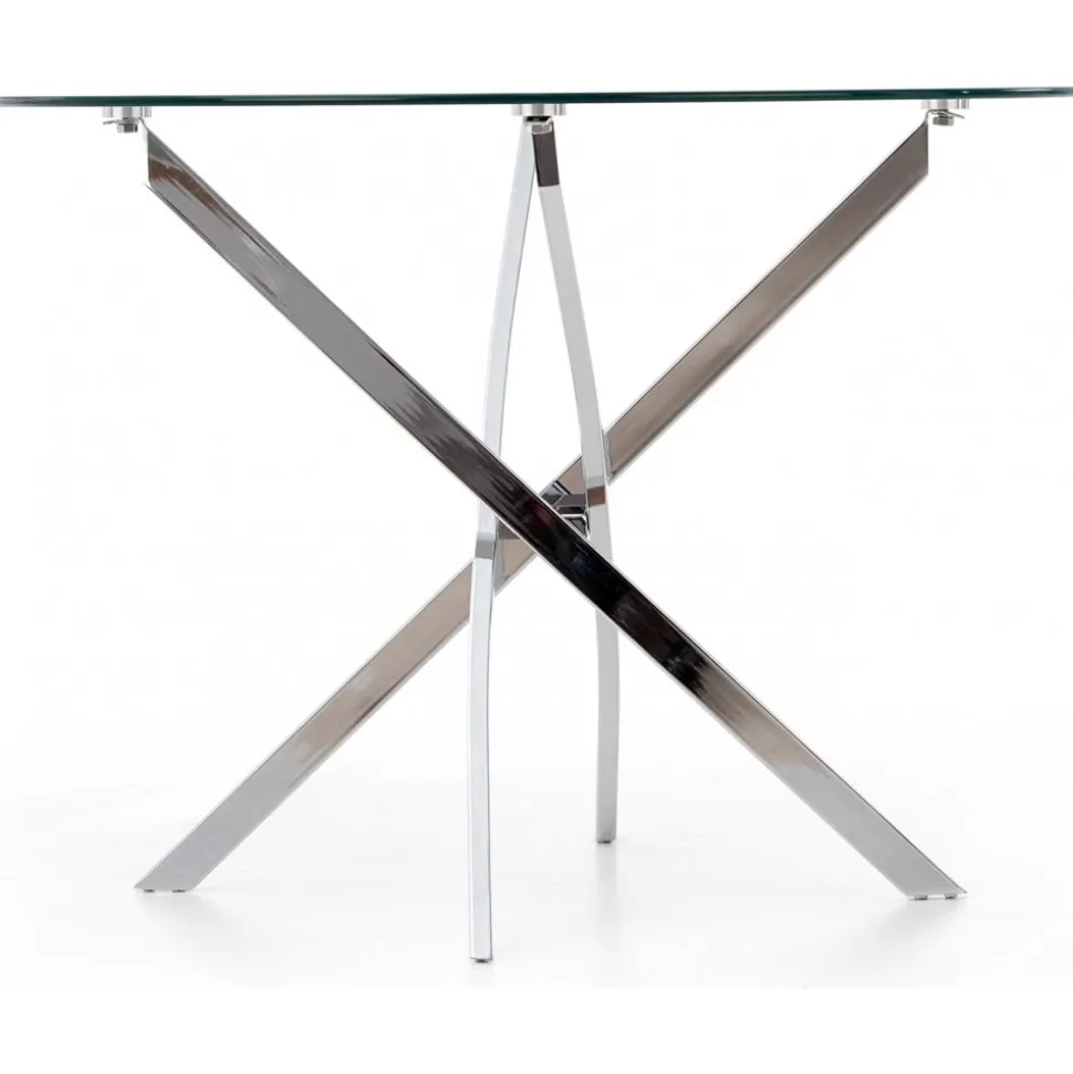 Matbord med bordsskiva av glas och underrede av krompläterad stål.