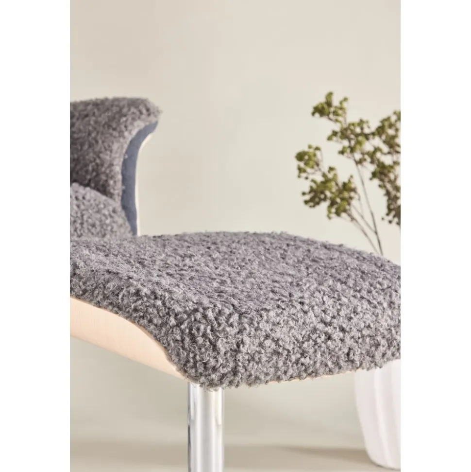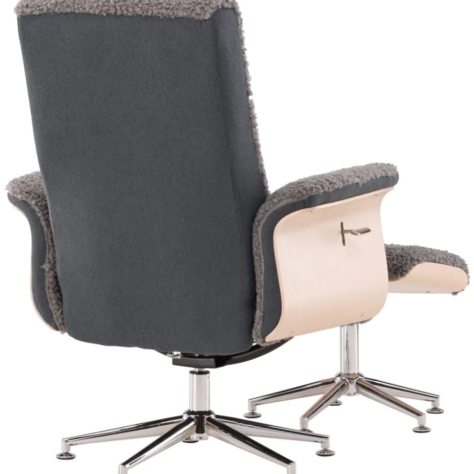 Här i grått teddy med trä på sidorna i vitpigmenterat ekutförande samt snurrbart stativ i kromad metall för att återge ett exklusivt utseende och känsla. Reclinerfunktionen går att ställa och låsa i olika ställningar. Matchande fotpall ingår.
