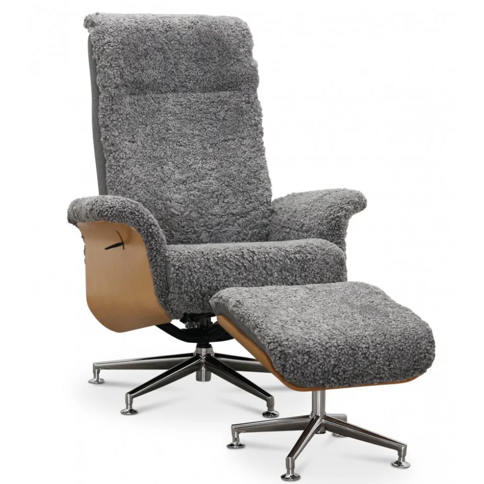 Reclinerfåtölj klädd i äkta ljusgrått fårskinn och har vackert oljad ek på armstöden vilket gör den till en med klassisk känsla. Fåtöljen passar lika bra i det traditionella som i det moderna hemmet med sin tidlösa design. Det kromade metallstativet ger en modern kontrast och förstärker den klassiska designen.