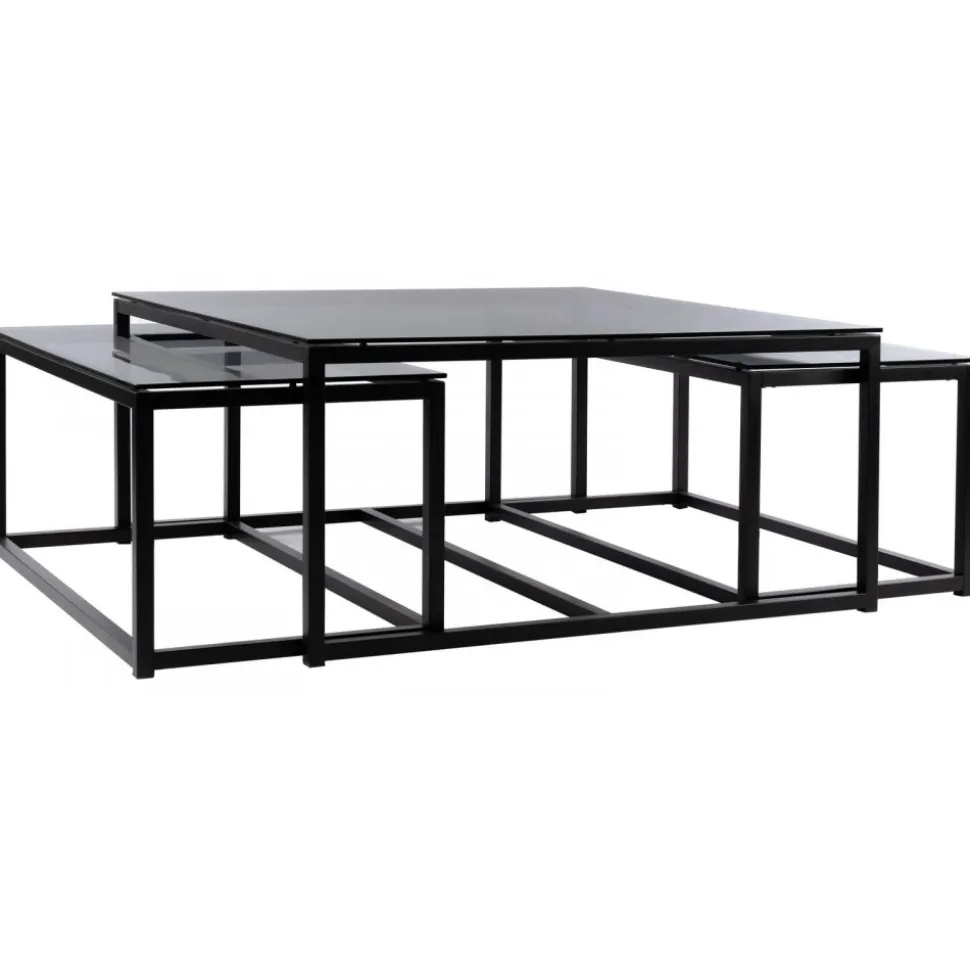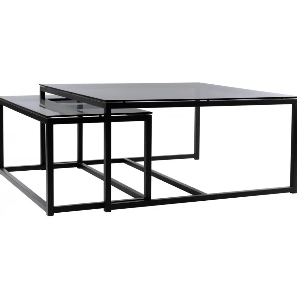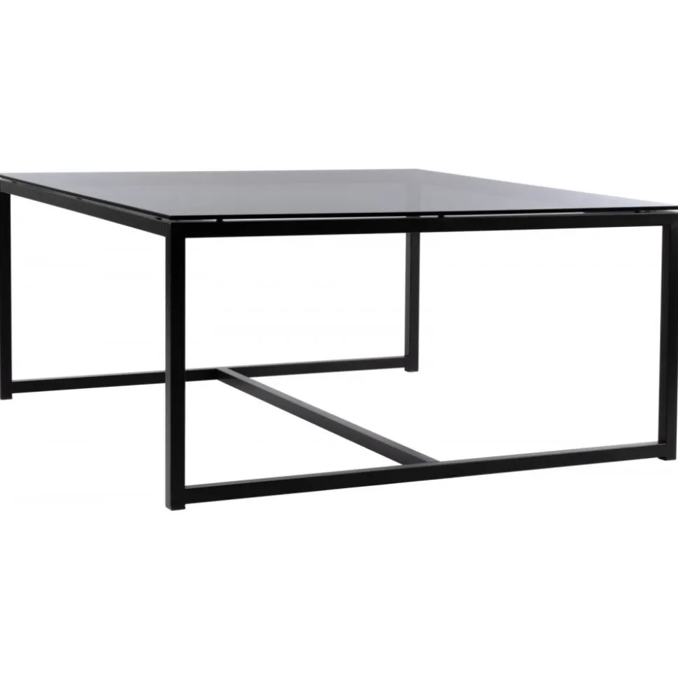 Soffbord med svart pulverlackerat metallunderrede och toppskiva i mörkt härdat glas.