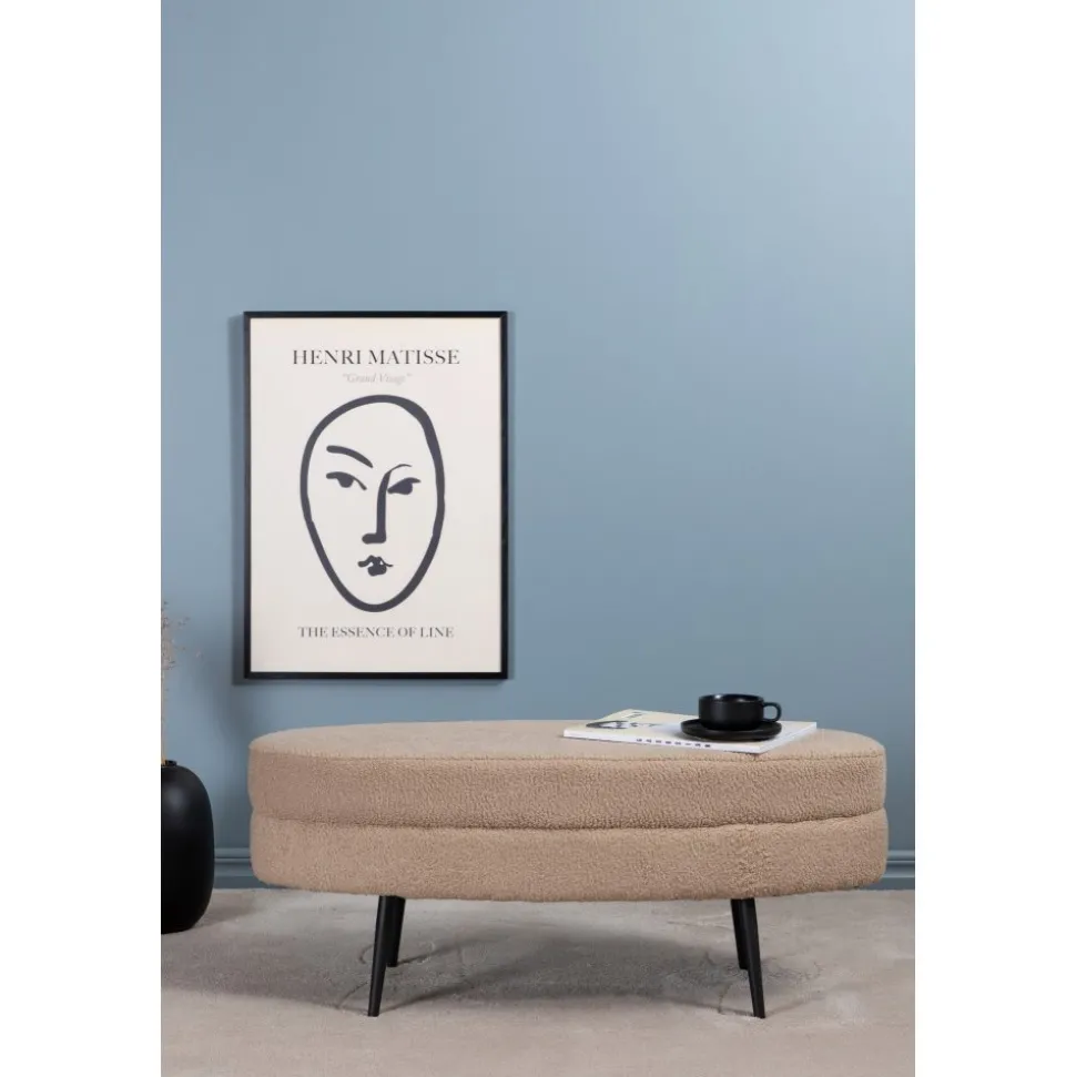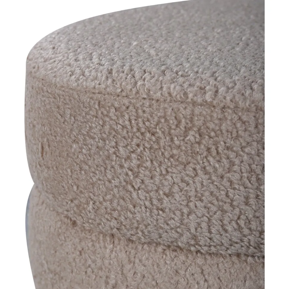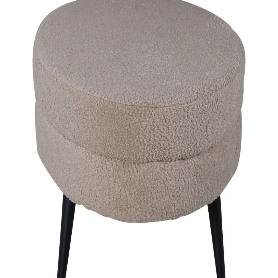 Sittpuff av trä och stål, klädd med polyestertyg.