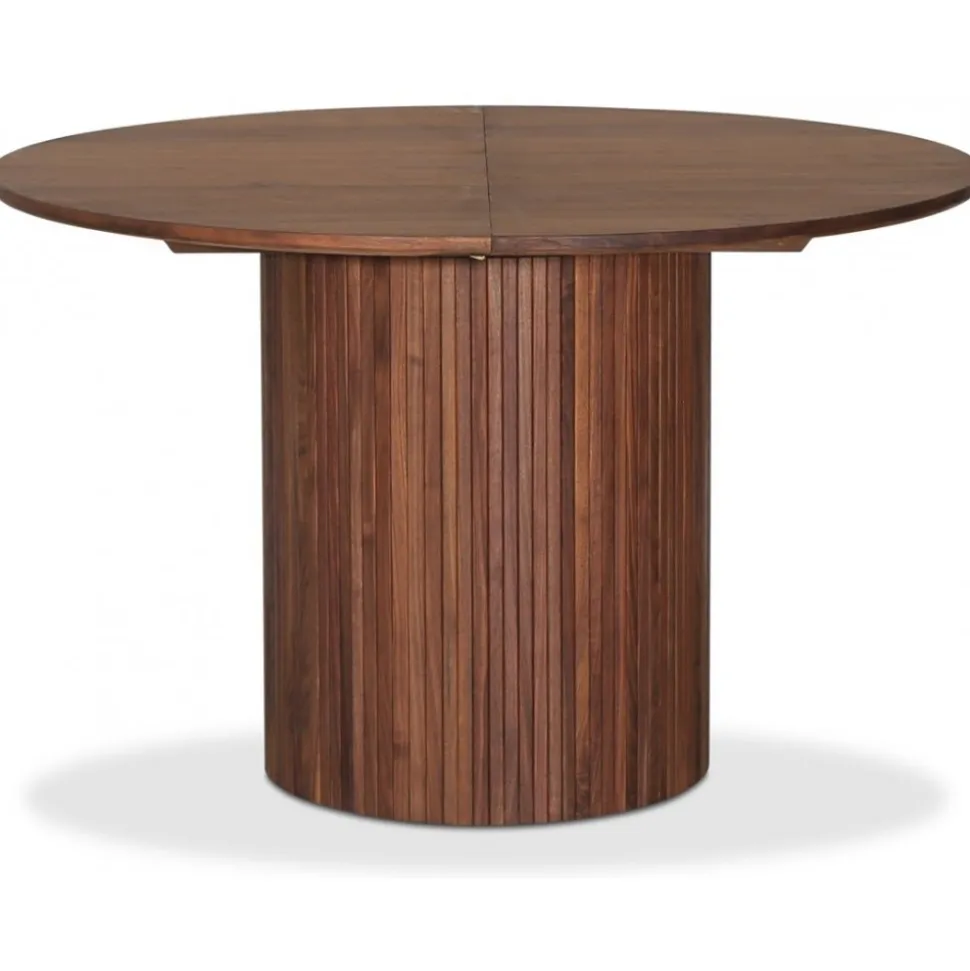 Detta runda matbord i elegant valnöt har en diameter på 115 cm och levereras med en smart, vikbar iläggsskiva som enkelt förlänger bordet till 160 cm. När iläggsskivan inte används förvaras den praktiskt i bordets mittdel. Tillverkat i en kombination av massivt trä och fanér för både hållbarhet och ett sofistikerat utseende.