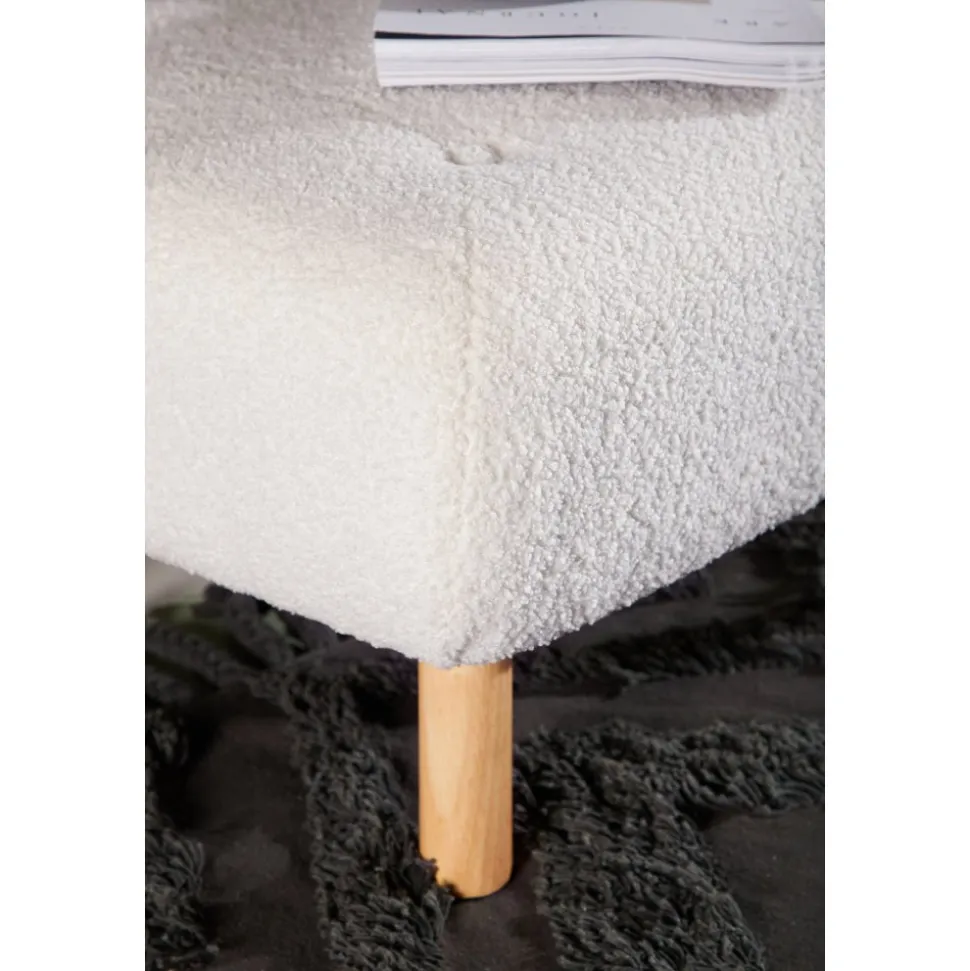 En trendig inredningsdröm som lyfter den varma och inbjudande känslan till rummet. Den här sittpuffen imponerar med sin lyxiga look och utgör en snygg inredningsdetalj. Tillverkad i benvit kulör av gosigt teddy tyg, trä och metall med djuphäftade knappar i tyget som blir till en läcker detalj. Puffen har en låg design med träfärgade ben som bidrar till en luftigare atmosfär och möjliggör enkel dammsugning.
