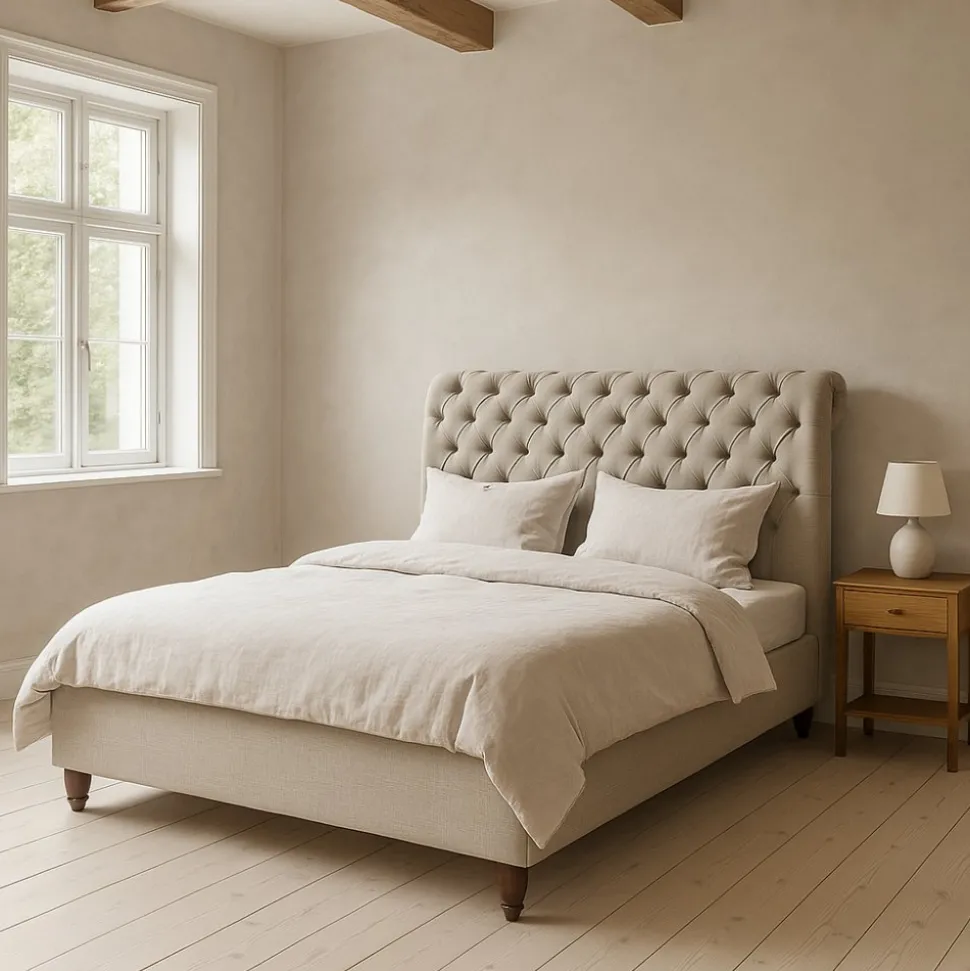 Ge ditt sovrum en känsla av tidlös elegans med denna vackra sängram. Den stilrena designen kombinerar klassiska former med modern komfort, och den djuphäftade sänggaveln med knappdetaljer skapar ett exklusivt intryck. Den rundade toppen och det mjuka tyget gör sängen till en naturlig mittpunkt i rummet.