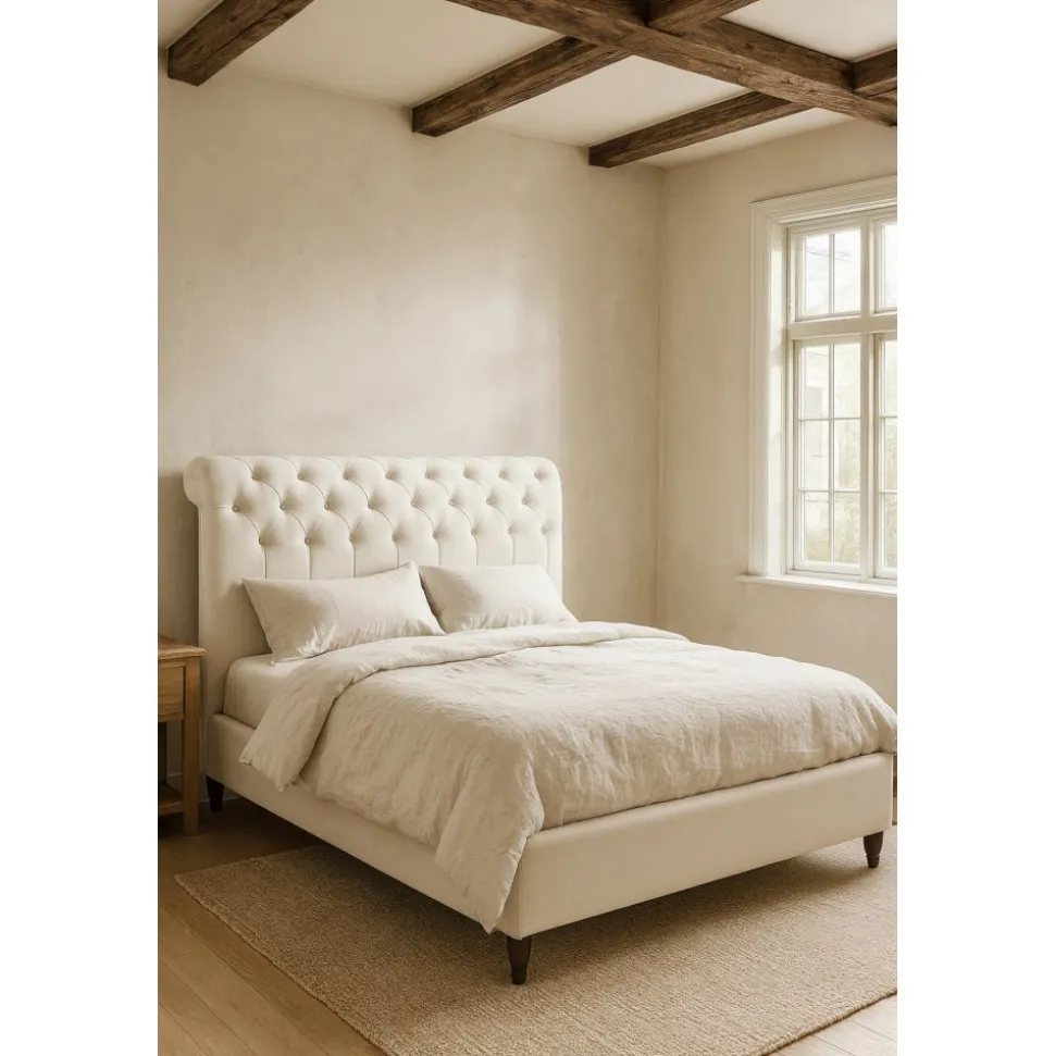 Ge ditt sovrum en känsla av tidlös elegans med denna vackra sängram. Den stilrena designen kombinerar klassiska former med modern komfort, och den djuphäftade sänggaveln med knappdetaljer skapar ett exklusivt intryck. Den rundade toppen och det mjuka tyget gör sängen till en naturlig mittpunkt i rummet.