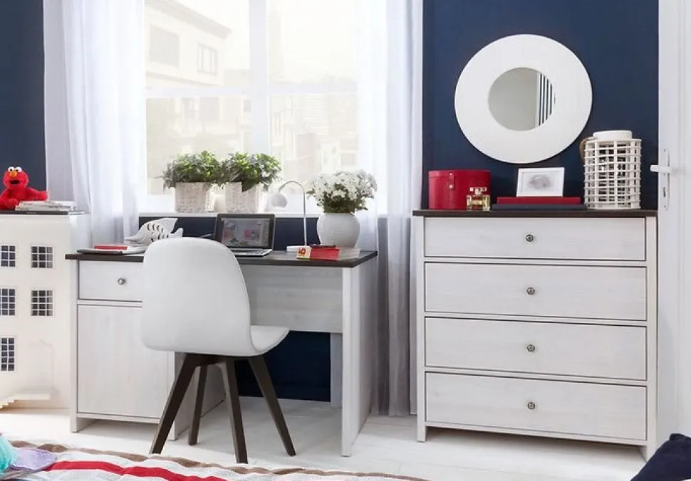 Praktiskt skrivbord med goda förvaringsmöjligheter i skåpet och lådan. Silverfärgade handtag som en snygg detalj.