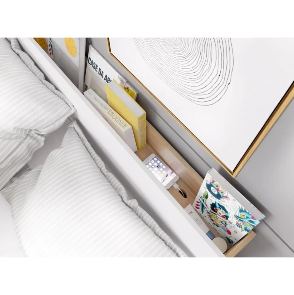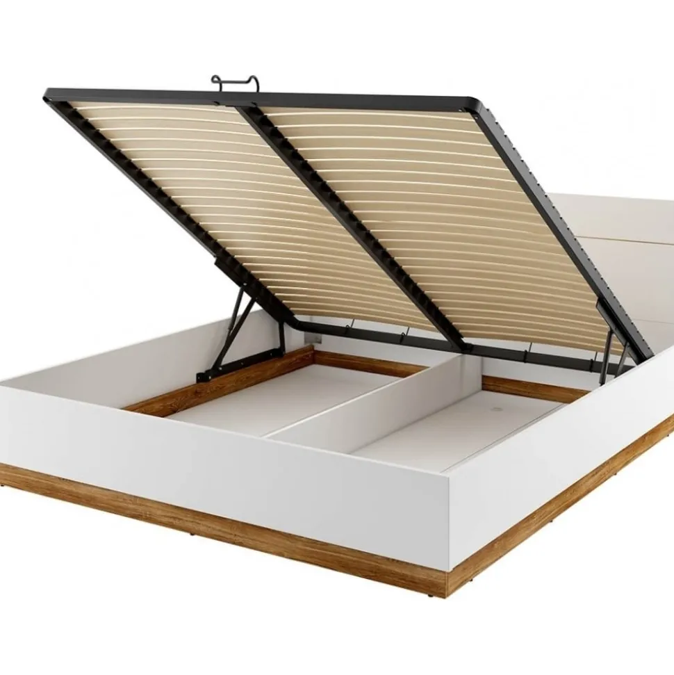 Säng av trä med förvaringsutrymme och integrerad sänggavel med LED-belysning. Gasfjädrar på båda sidor hjälper till att lyfta och hålla uppe ribbotten för åtkomst till förvaringsutrymmet. Levereras omonterad.