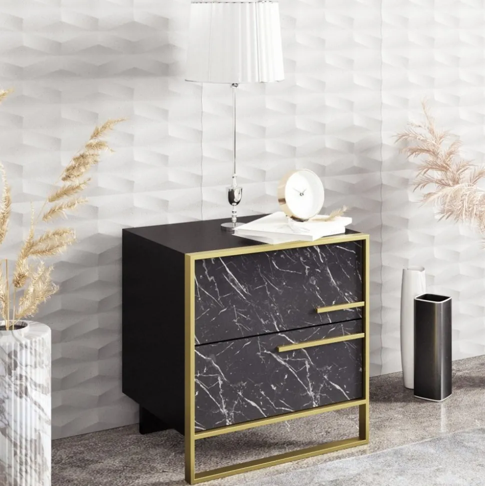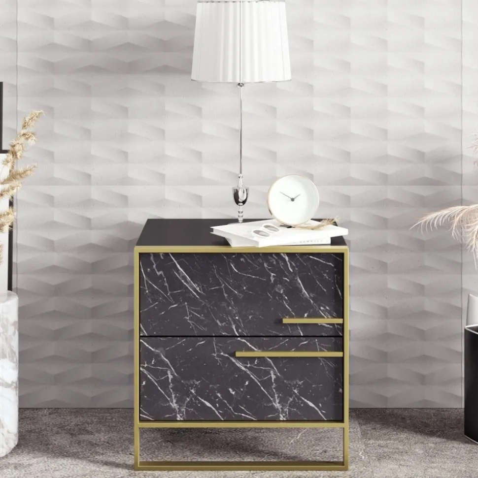 Sängbord av trä och metall.