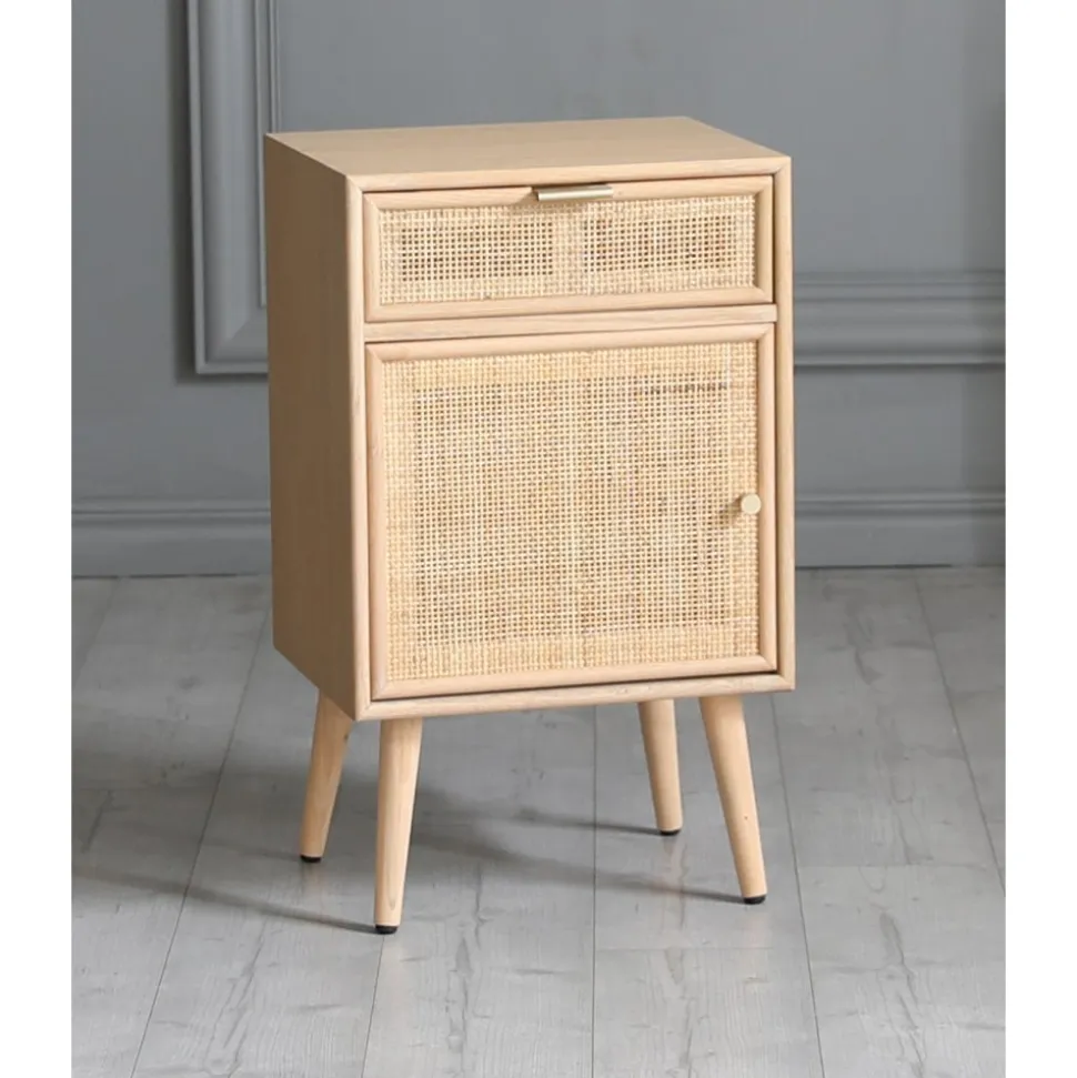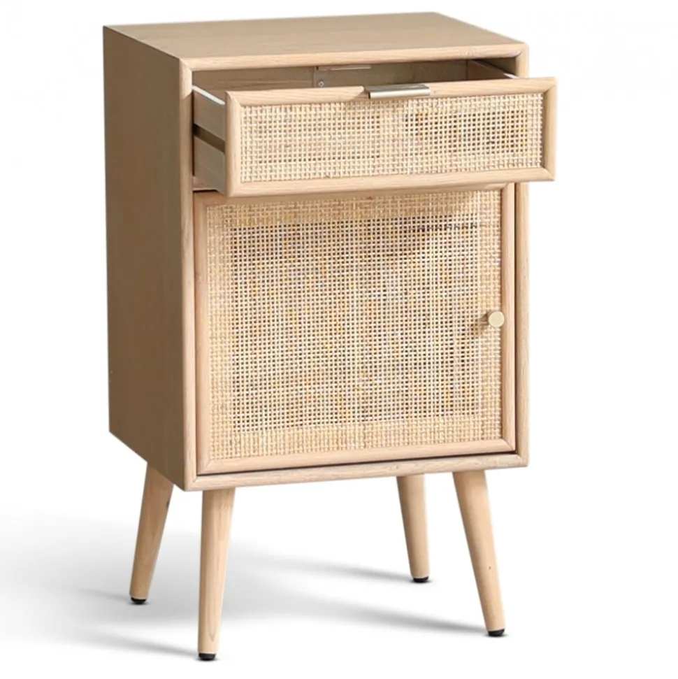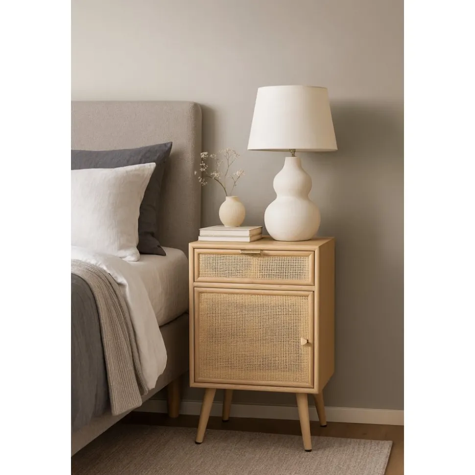Sängbord som är designat för att passa in i moderna hem där både estetik och praktiska behov tas i beaktning. Den eleganta kombinationen av ekbetsat trä och ljus rotting skapar en harmonisk look som kan enkelt matchas med olika inredningsstilar, från skandinavisk minimalism till mer bohemiska arrangemang. Med sin optimala höjd är det lättillgängligt och fungerar som en perfekt plats för att ställa din bok, kopp med te eller väckarklockan. Stockholm är en stilfull möbel som förenar funktionalitet och design. De vackra fronterna i ljus rotting ger en luftig och modern estetik, perfekt för den som uppskattar detaljer.