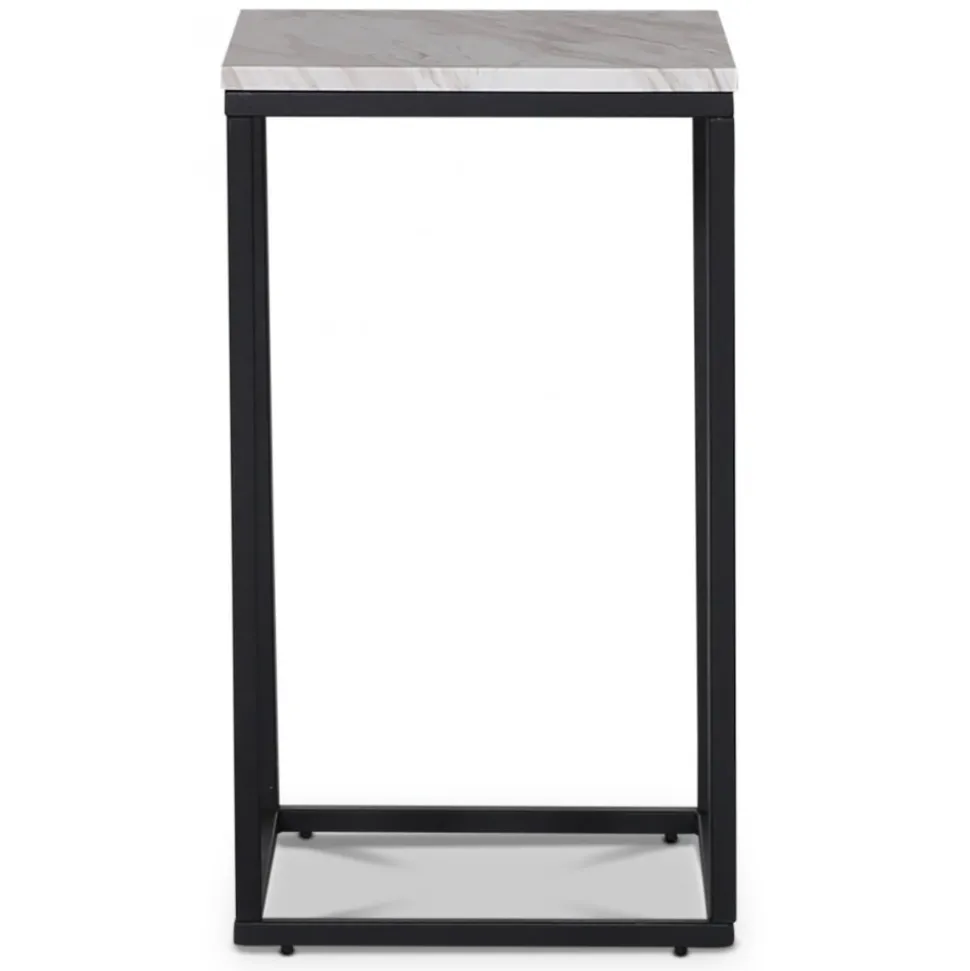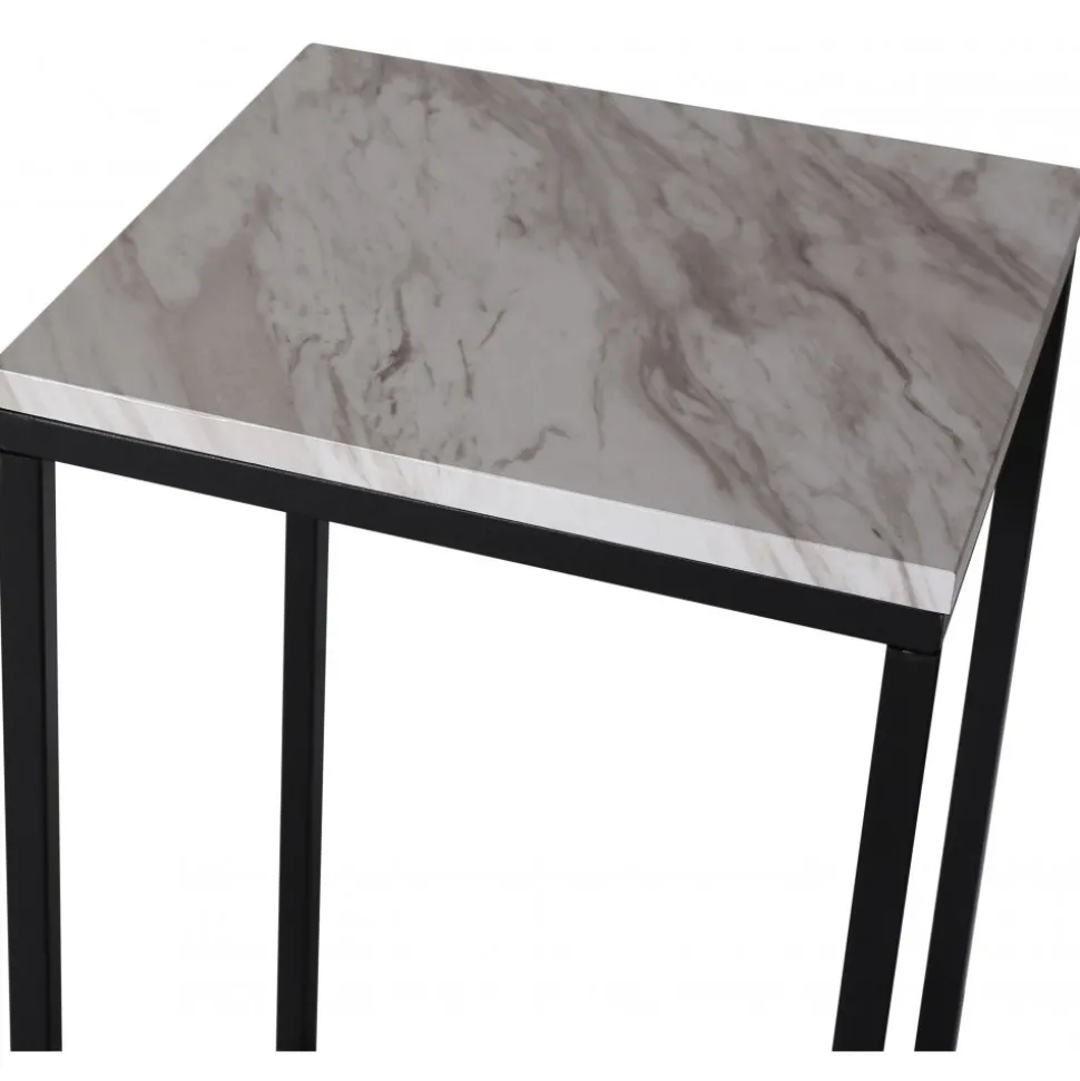Sängbord med toppskiva i ljus marmorimitation (MDF) med underrede i svartlackad metall. Ett stiligt och prisvärt med tålig och slitstark yta.