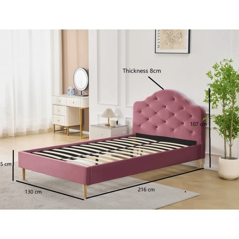 Lemings med ben av trä. Ribb-botten av plywood. Rosa mjukt tyg på både ram och sänggavel.