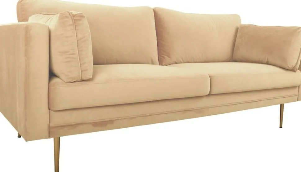 Soffa klädd med ett beige sammetstyg i 100% polyester, stomme i massivt trä.