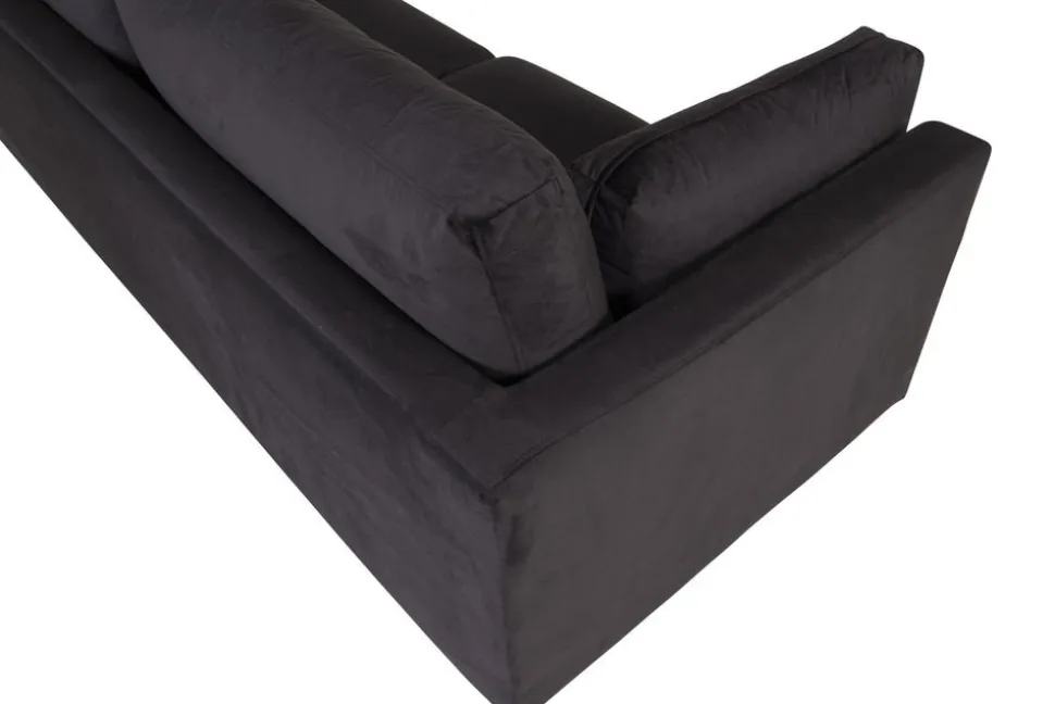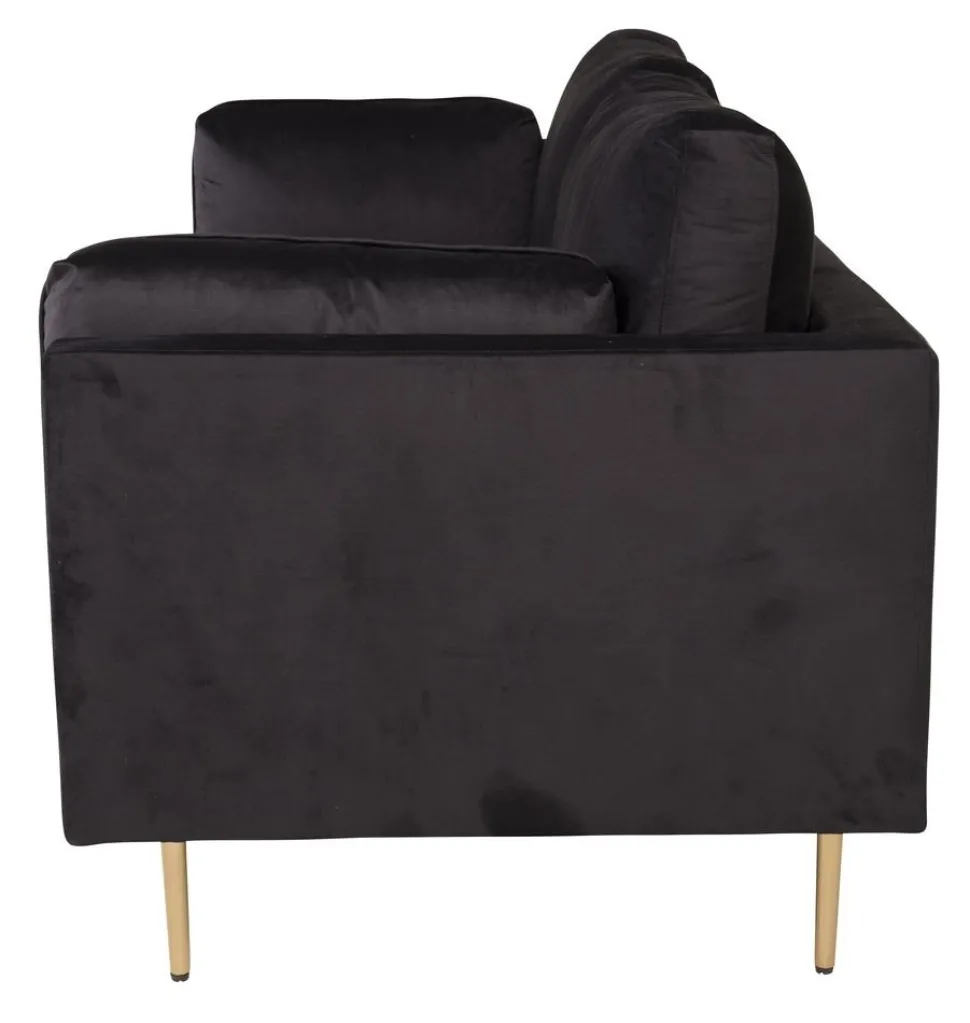 Soffa klädd med ett svart sammetstyg i 100% polyester, stomme i massivt trä.