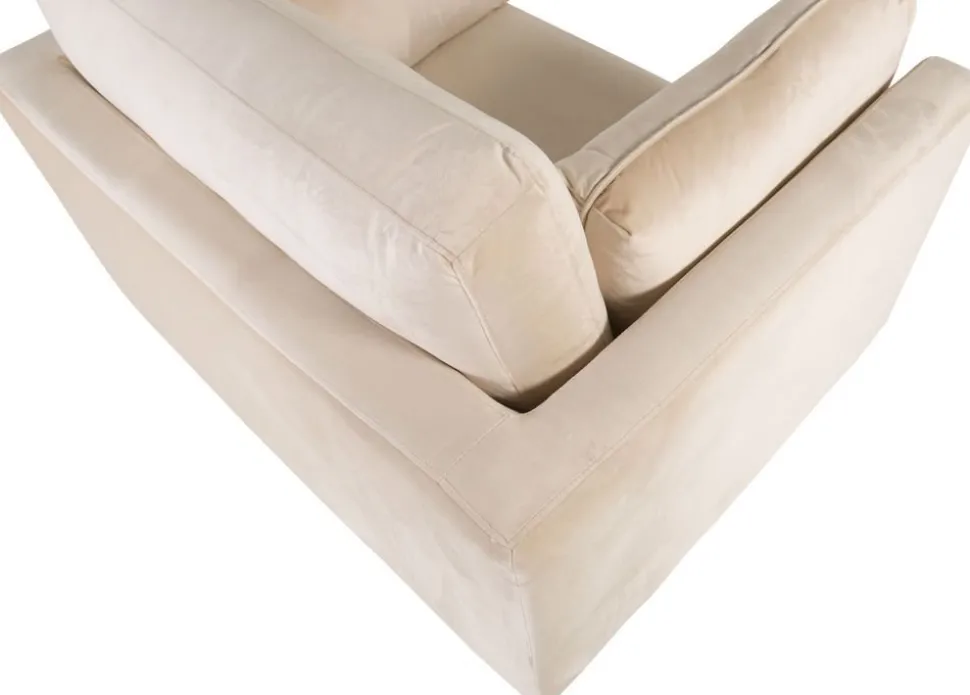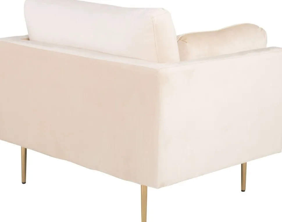 Fåtölj klädd med ett beige sammetstyg i 100% polyester, stomme i massivt trä.
