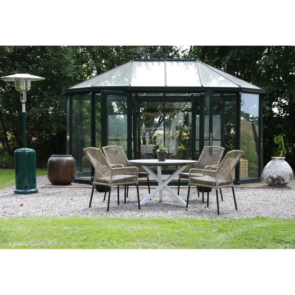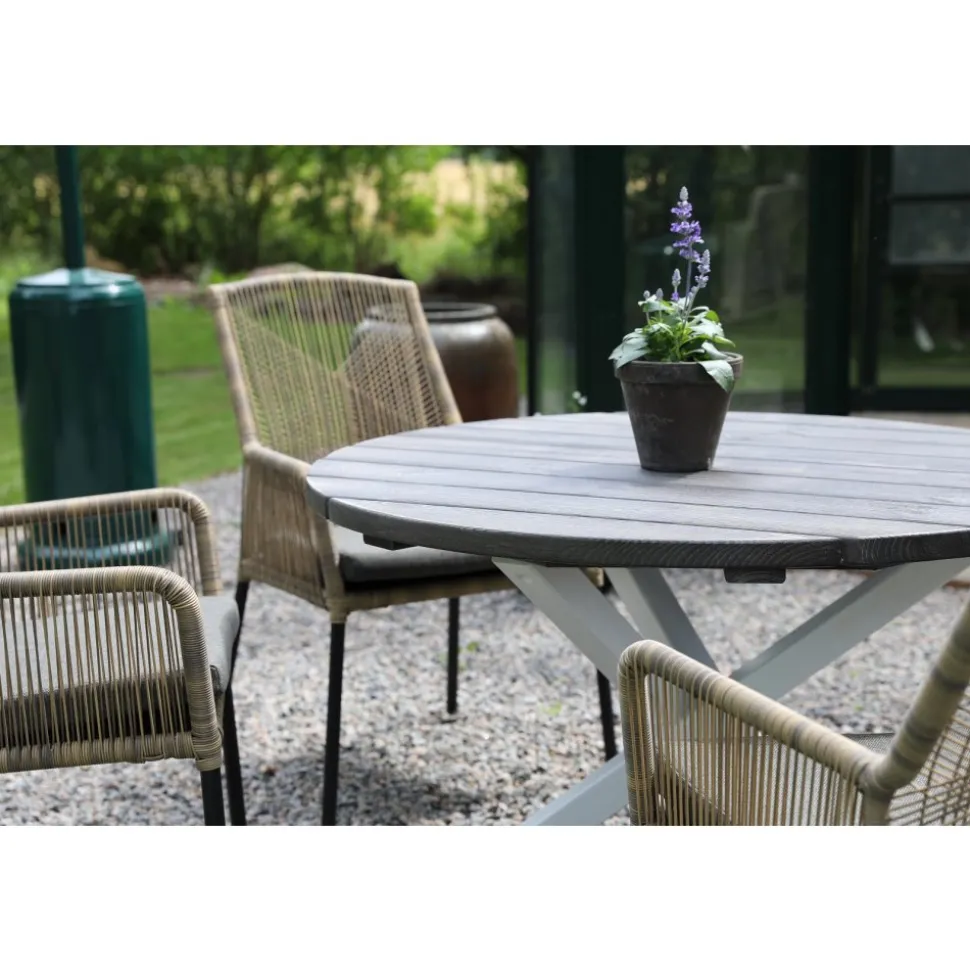Scottsdale matgrupp för uteplatsen med ett runt rubust matbord, tillsammans med Ystad karmstol med skön komfort. Bordets topp är av grålaserad furu med vitt underrede. Ystad karmstol är i beige tvinnad konstrotting med en grå dyna vilket gör utegruppen väderbeständig och tålig för att klara uteplatsens miljö.