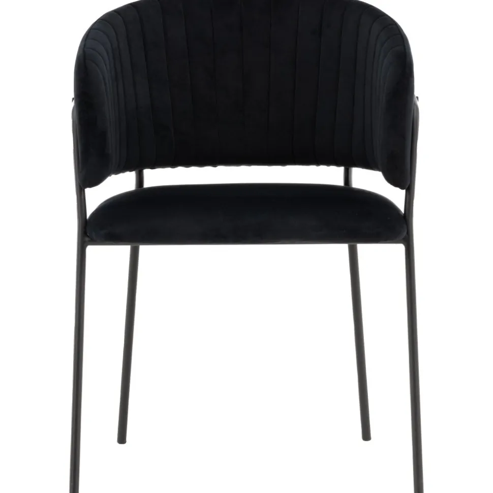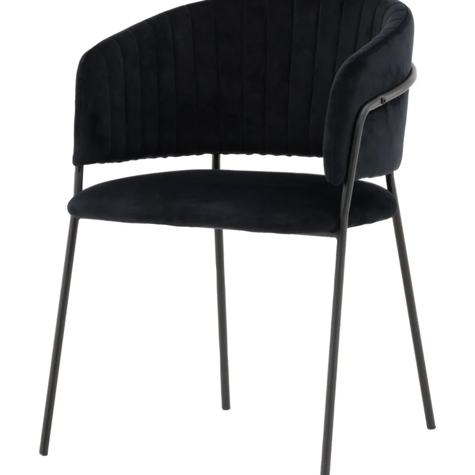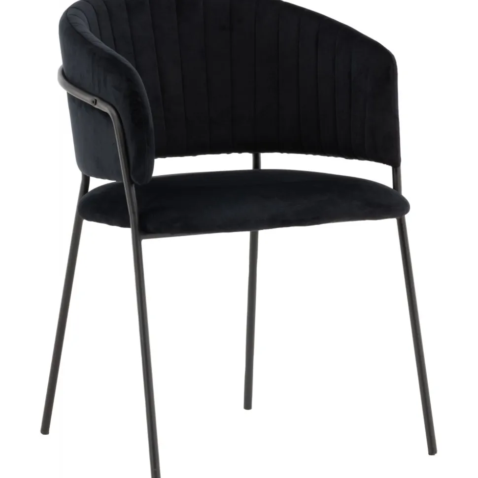 Möblera hemmets hjärta modernt, bekvämt och tidlöst med denna iögonfallande i kaxig svart kulör! Den här matstolen har en helklädd design med lätt rundad rygg och sits i sammetstyg med snygga dekorsömmar och stolsbenen är smala i svart stål. Skapa en inbjudande och trivsam look och njut av härliga måltider tillsammans!