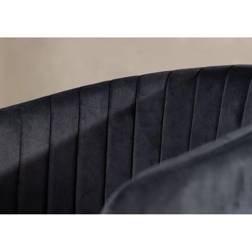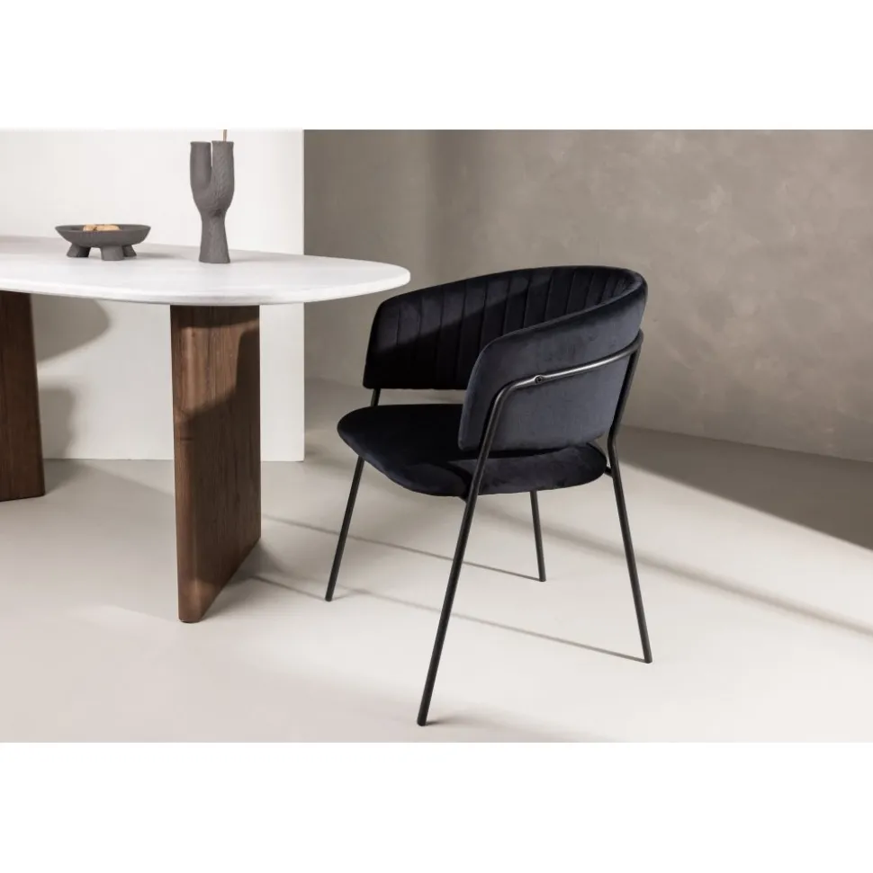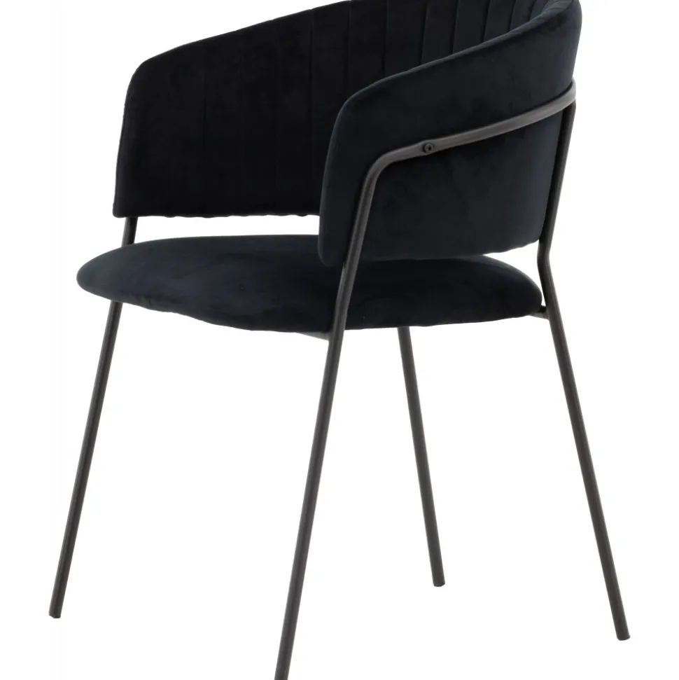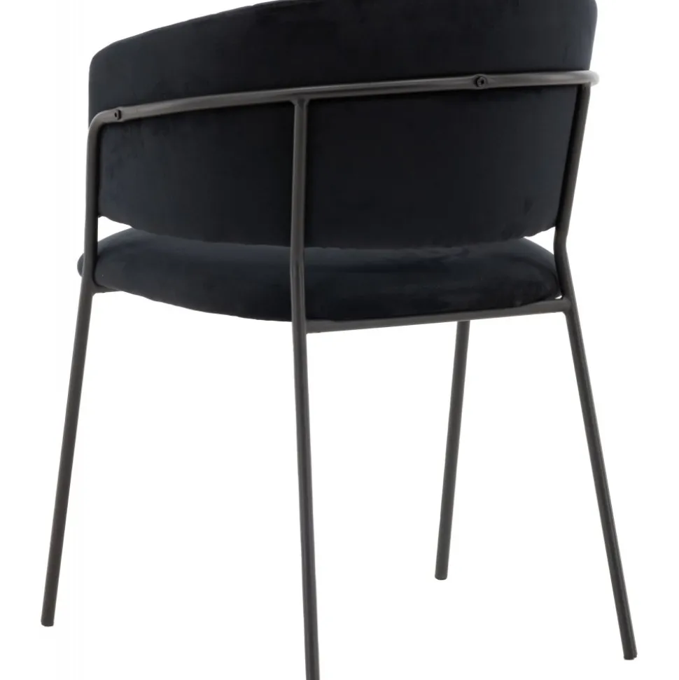 Möblera hemmets hjärta modernt, bekvämt och tidlöst med denna iögonfallande i kaxig svart kulör! Den här matstolen har en helklädd design med lätt rundad rygg och sits i sammetstyg med snygga dekorsömmar och stolsbenen är smala i svart stål. Skapa en inbjudande och trivsam look och njut av härliga måltider tillsammans!