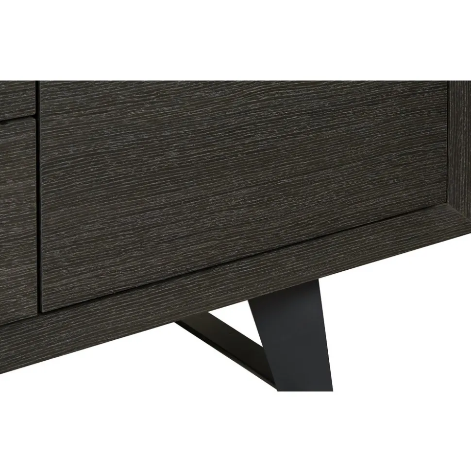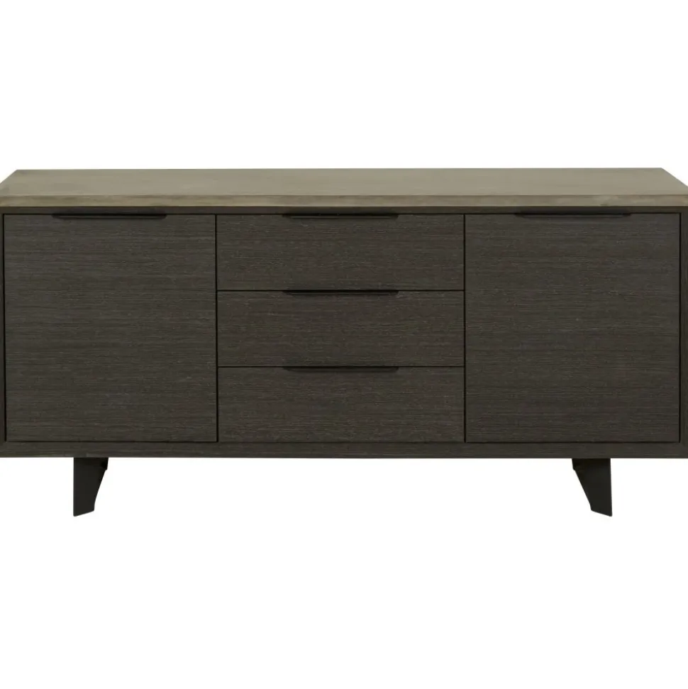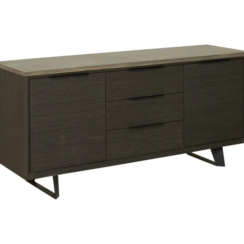 En snygg och stilren skänk med en modern design. Skänken är tillverkad av MDF med mörkbetads ekfanèr. Toppskivan är i massiv betong. Metallben.