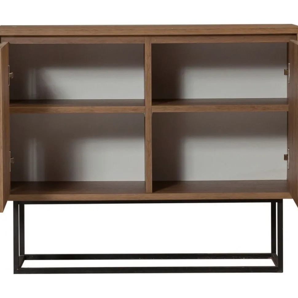 Modern skänk i vintage stil. Skänken är tillverkad i melaminbelagd spånskiva i valnötsliknande utförande. SKänken har två lukor på framsidan med bra förvaring som döljs av de stängda luckorna. Skänken står på en ställning i svartlackad metall som skruvas fast i skänken.