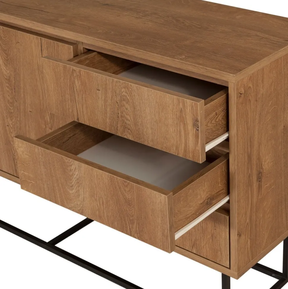 Ruba skänk kombinerar varm valnötsfinish med robust svart metall för en design som både känns modern och tidlös. Den rika trätonen ger värme och karaktär till rummet, medan metallens mörka kontrast framhäver möbelns eleganta linjer. Passar lika bra i matsalen som i vardagsrummet eller hallen.