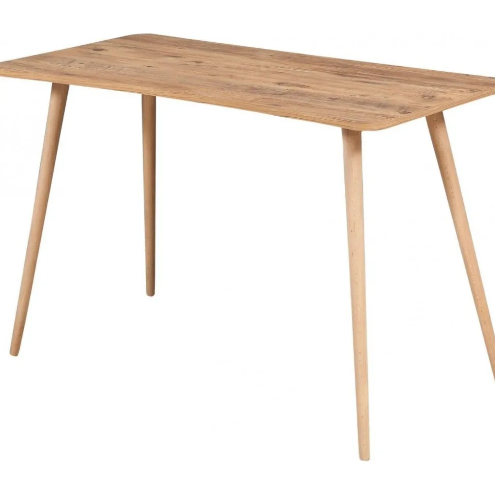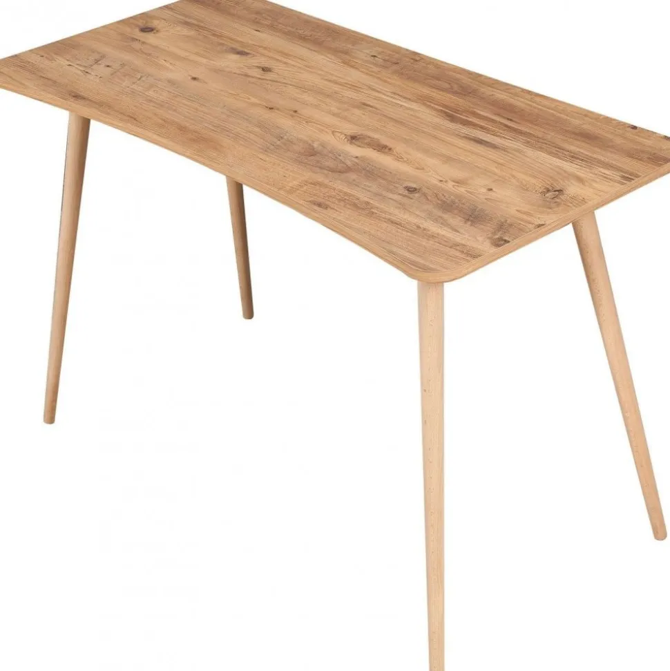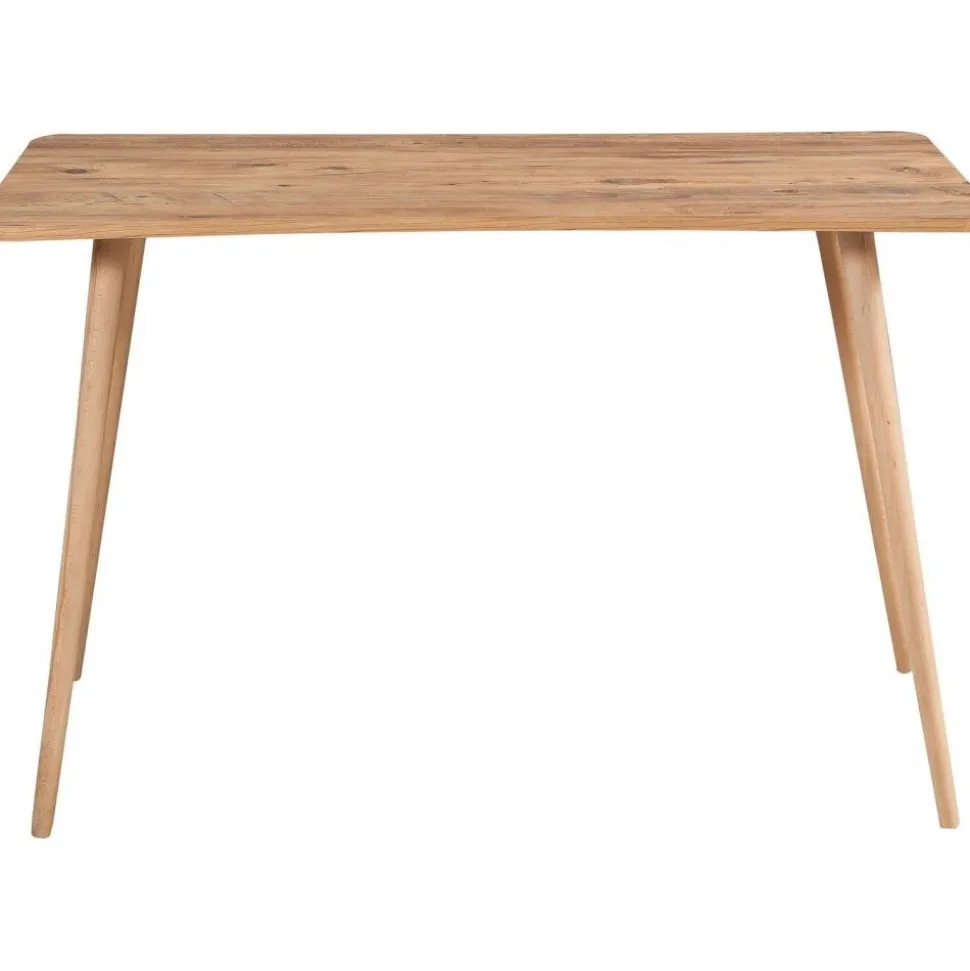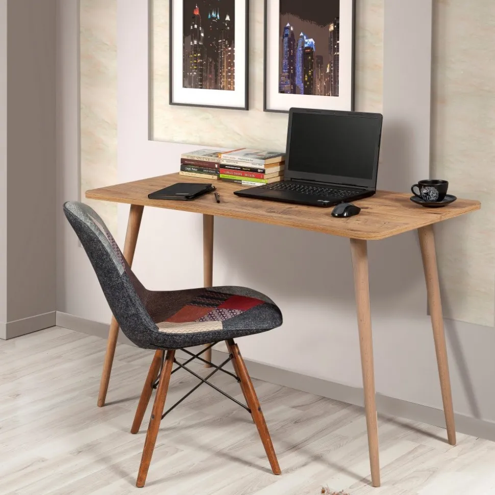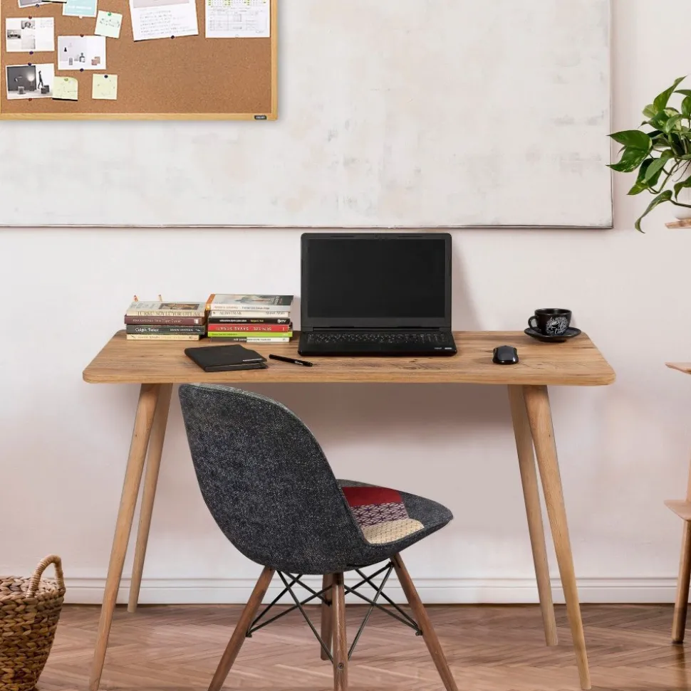 Skrivbord av spånskiva med ben i massivt trä.