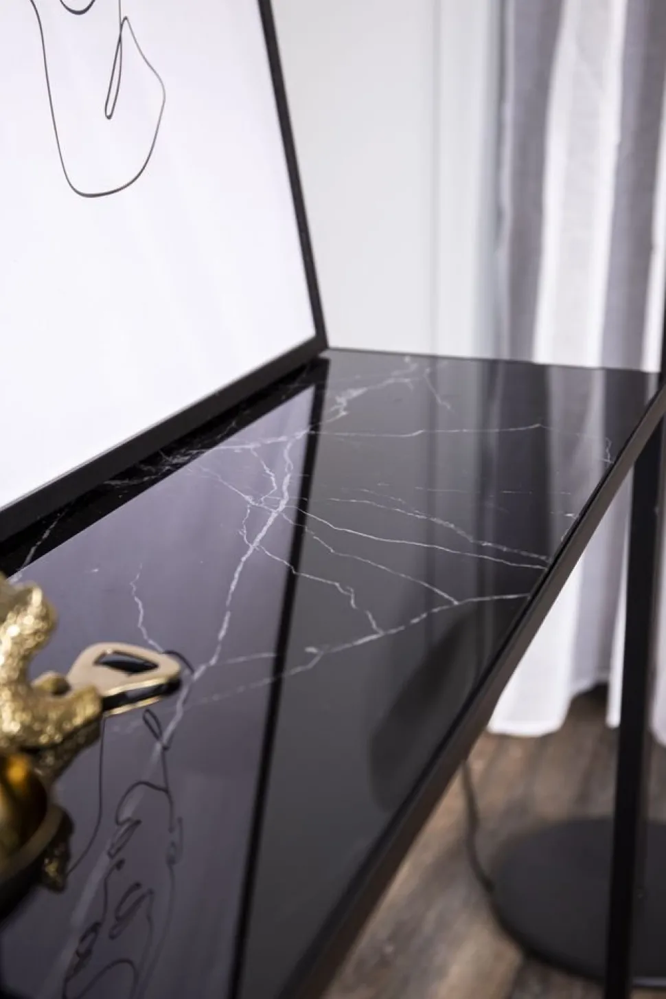 Avlastningsbord med svart mönstrad glasskiva och underrede i svart metall. Detaljer i mässing nertill av benen.