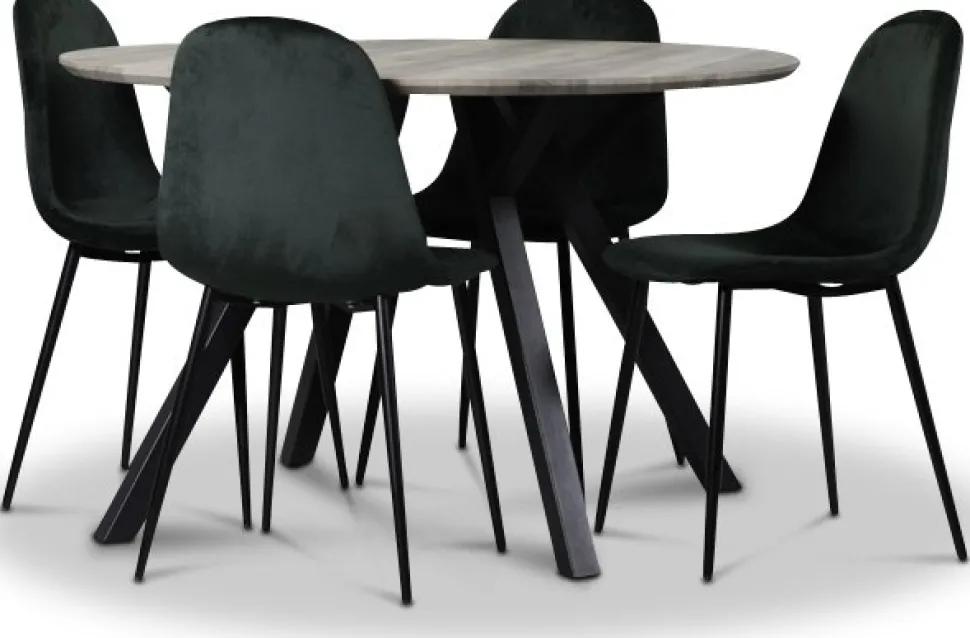 Matgrupp från Skånska Möbelhuset, Smokey matbord 120 cm i diameter med mdf-toppskiva med ljus betsad ekfoliering. Medföljer 4 st matchande Carisma sammetstolar i mörkgrön sammet med svarta ben.